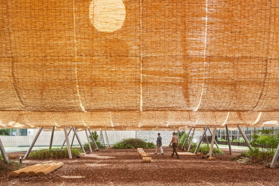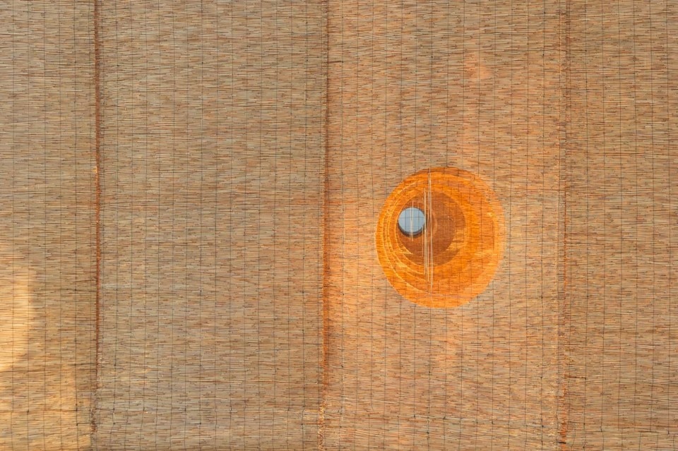 Sotto il padiglione, un prato con delle stuoie permette di osservare la struttura e riposare. Una serie di ritagli circolari sul tetto rivela l’ambiente locale e permette il passaggio di una leggera brezza che fa ondeggiare la struttura. Alcuni dei portali tendono ad allinearsi con gli altri, offrendo una prospettiva stratificata.