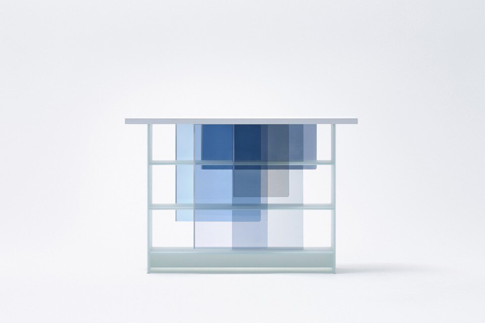Nendo, Layers. Mobile realizzato interamente in vetro con ante scorrevoli appese al top