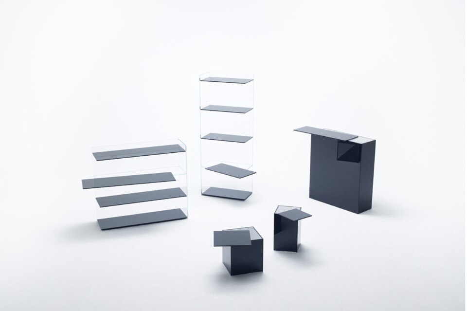 Nendo, Pair. Gli elementi sono ottenuti sovrapponendo due mobili in vetro fumé