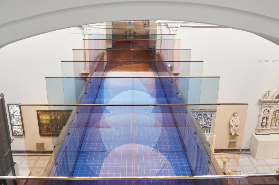 Il tema delle griglie prospettiche, emerso in epoca rinascimentale che si può vedere negli oggetti di grandi dimensioni in mostra sotto il ponte, ha influenzato il disegno del rivestimento ceramico della pavimentazione. Johnson Tiles ha creato queste piastrelle utilizzando la tecnologia Artile, che stampa un disegno a colori su misura sulle piastrelle – ogni sezione ha il 3% in meno colore rispetto alla precedente per creare un effetto sfumato da un capo all’altro. I colori tenui di ognuna delle strutture di acrilico trasparente che le sovrastano variano anche per contorni e sfumature per creare un effetto sottile, quasi fluttuante, che integra i materiali esposti nelle adiacenti Glass galleries e ottimizza la luce naturale del museo.