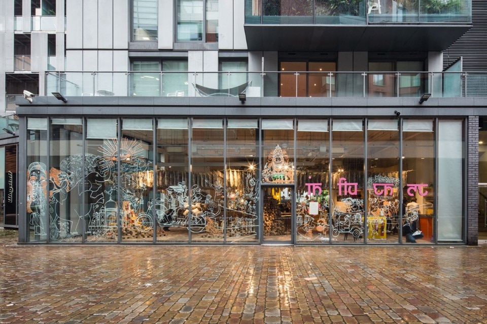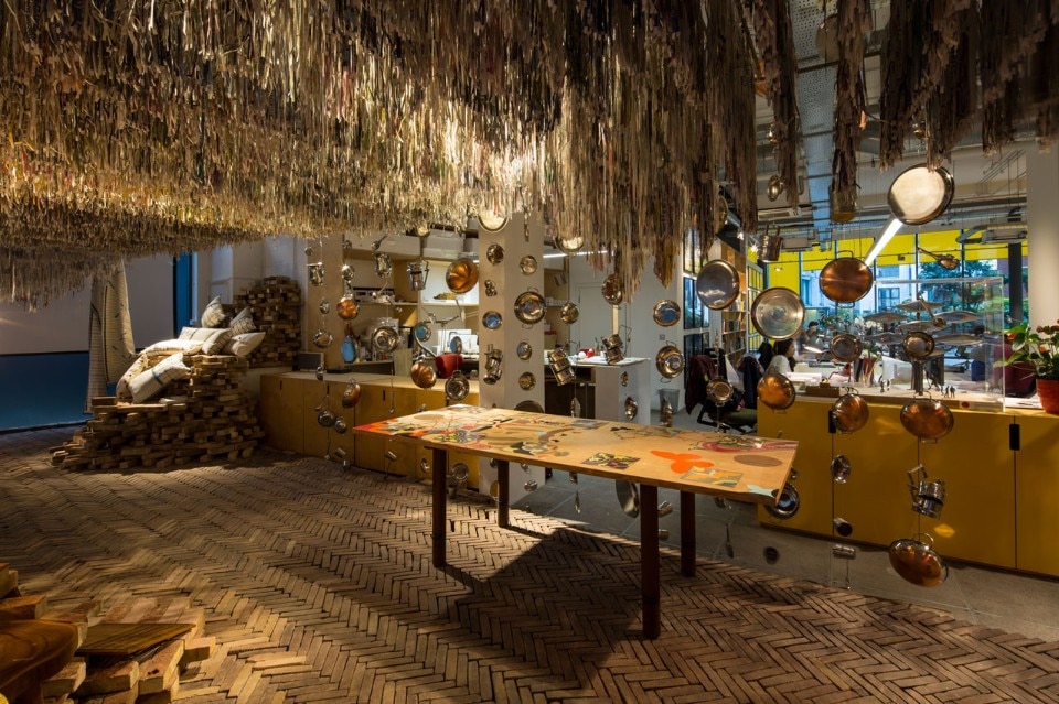 INfluence 2015, vista dell'allestimento allo Studio Egret West, Londra. Le stoviglie in acciaio e la famosa scatola tiffin rappresentano l'India. Robuste, leggere, e facili da pulire, queste stoviglie hanno tuttavia un'estetica raffinata. Non decorate, pensate per l'impilabilità e l'igiene, hanno una riflettenza che permette loro quasi di scomparire mentre valorizzano il cibo e le salse colorate al loro interno. Il "muro" di Studio Egret West, fatto con duecento pezzi di stoviglie, crea uno schermo di specchi che si muove come un mobile gigante, riflette il resto della mostra e introduce un caos visivo simile alle scene di strada in India. Quando le parti si toccano i visitatori sentono il suono delle cucine indiane