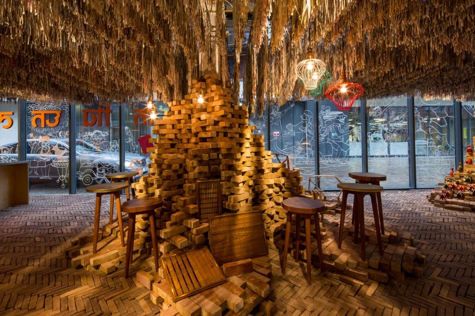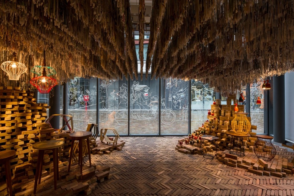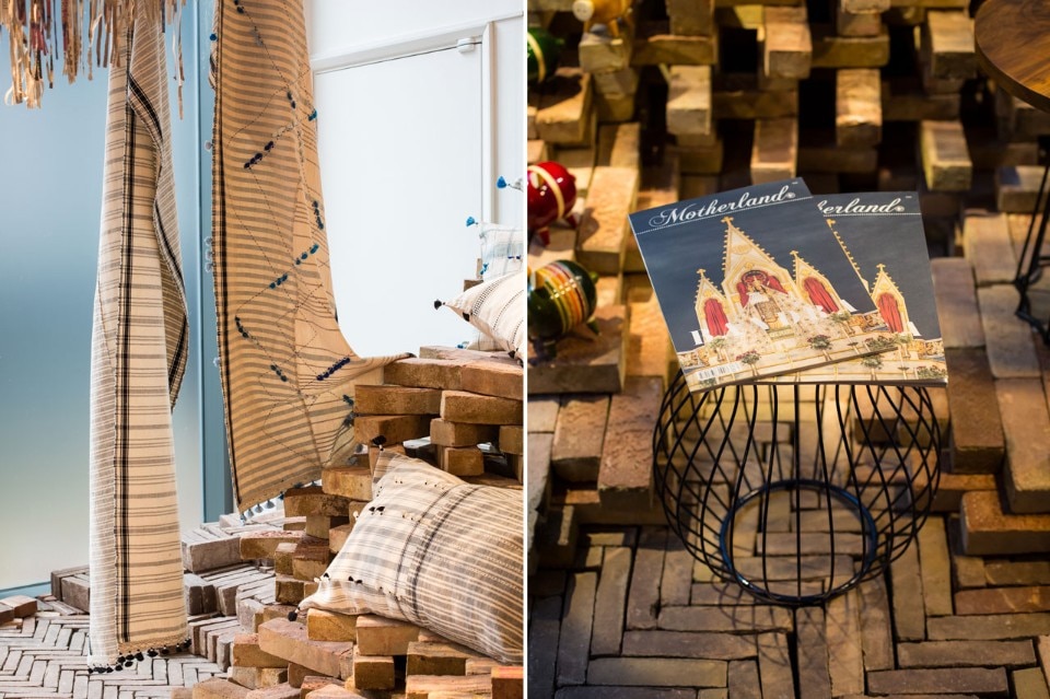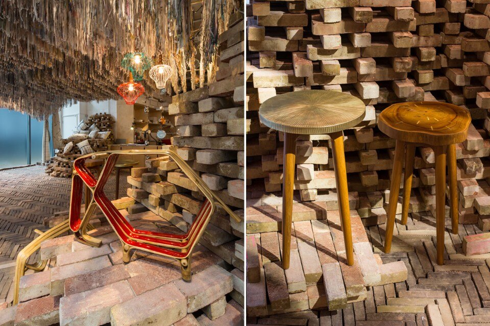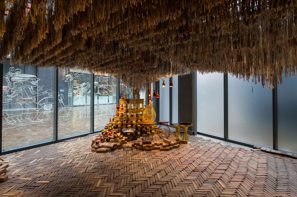 INfluence 2015, vista dell'allestimento allo Studio Egret West, Londra. Acme ha scelto i mattoni perché sono un materiale onnipresente nell'India occidentale che permetteva loro di creare qualcosa che, proprio come gli oggetti stessi, sta tra il primitivo e il sofisticato e di generare un senso di ripetizione con varietà, instabilità e leggerezza. I 7.220 mattoni delimitano l'area espositiva e creano semi-strutture informali per sostenere gli oggetti
