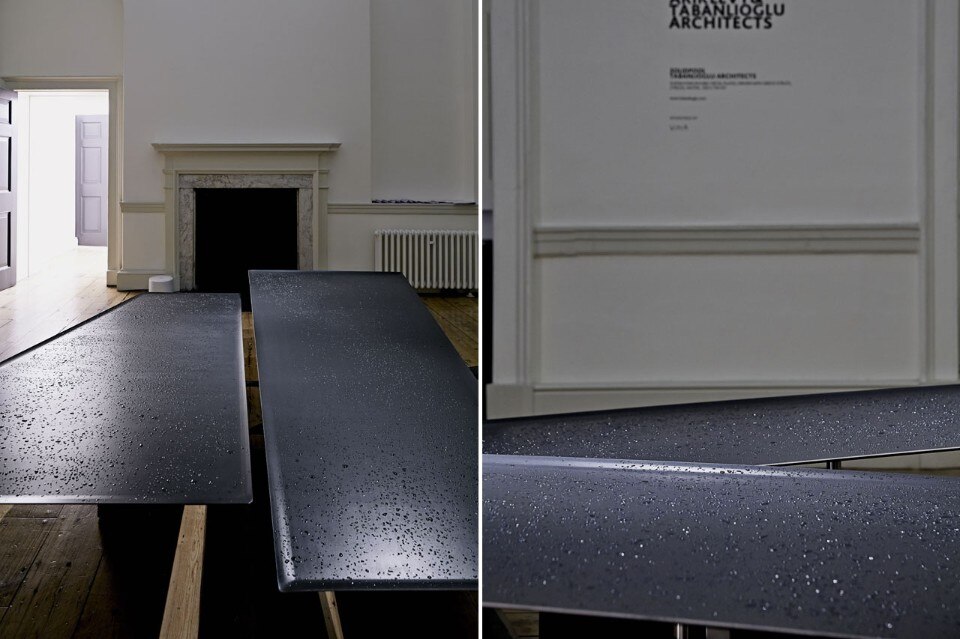 Le superfici sono coperte d’acqua, ma nonostante i loro movimenti, le goccioline rimangono fisse. L’innata tendenza ad unirsi delle particelle liquide è messa in discussione. In questo modo la scultura riflettente esplora la natura della tensione, dell’attrazione e dell’intervento attraverso un elemento di base, l’acqua. Non in stato di quiete come su una ninfea ma, piuttosto, in tensione sulla placca di metallo che oscilla in direzioni diverse, le gocce si sforzano di rimaere integre e cercano un nuovo modo di scorrere.