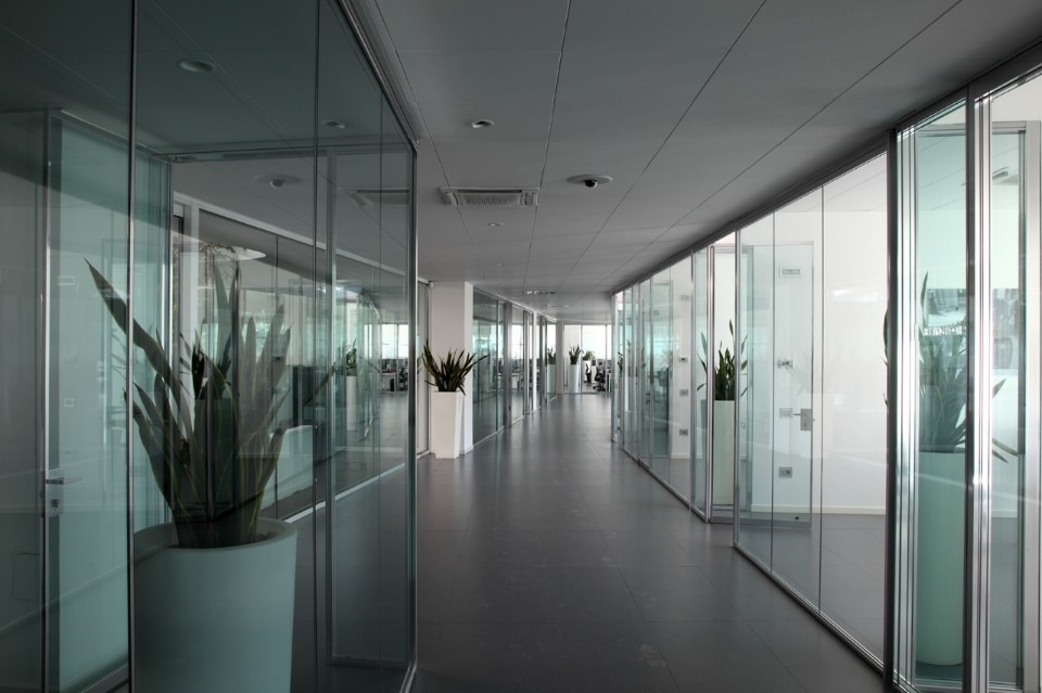 La hall, progettata come spazio permeabile e trasparente di tipo semi-pubblico, funziona come una sorta di piazza interna che si schiude verso l’esterno mentre, sull’asse verticale, funge da elemento di collegamento dei livelli, dal lucernario all’interrato.