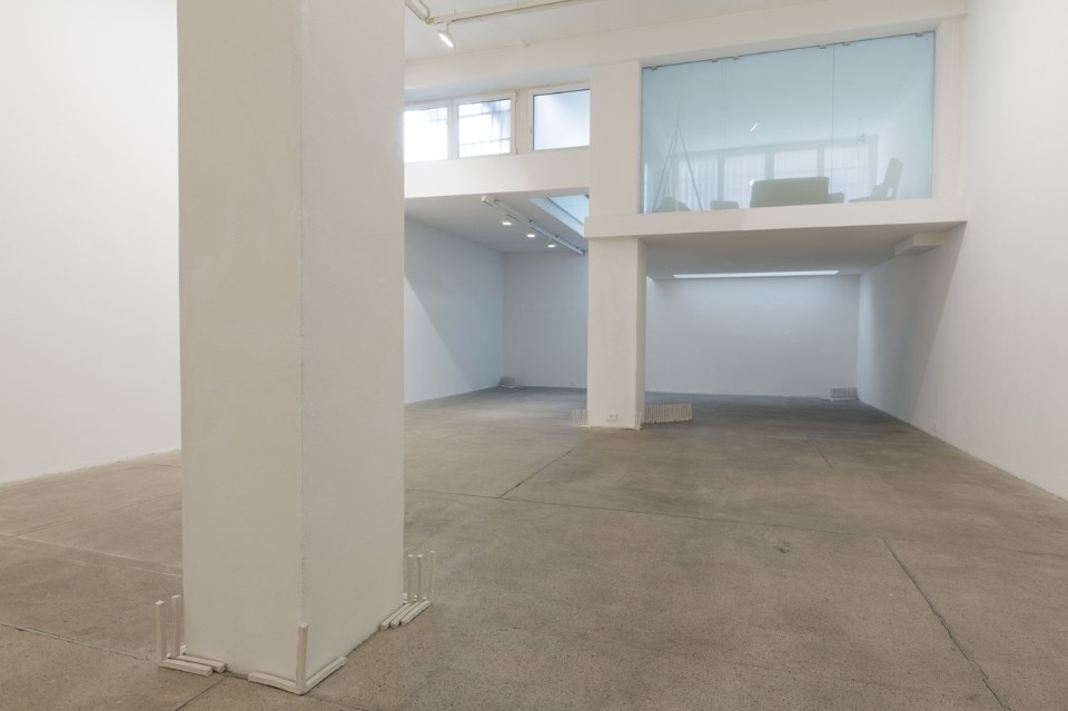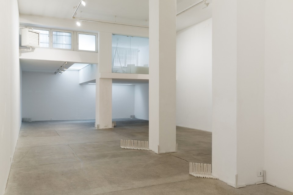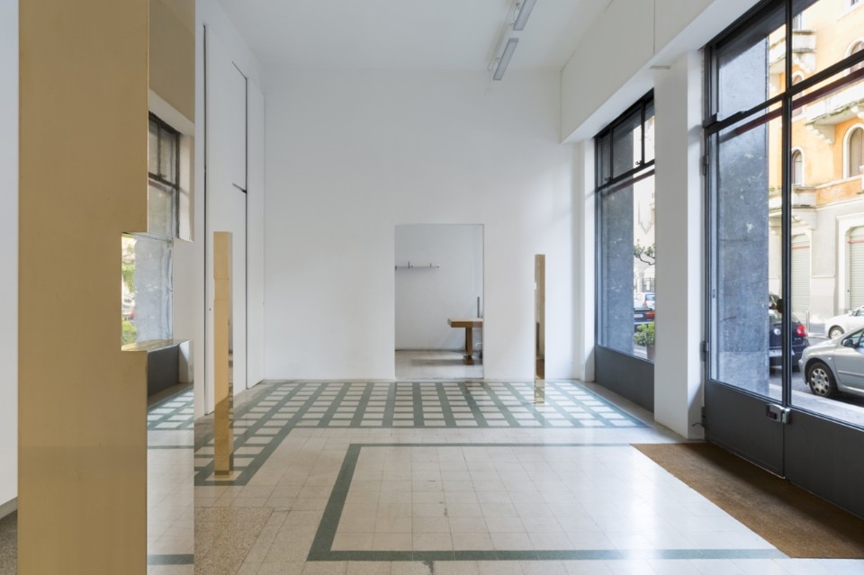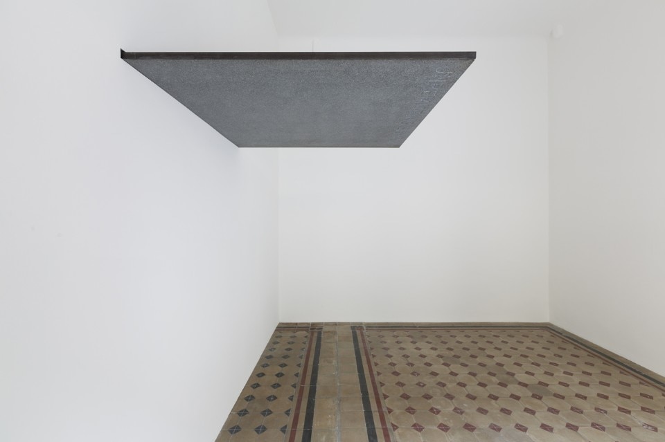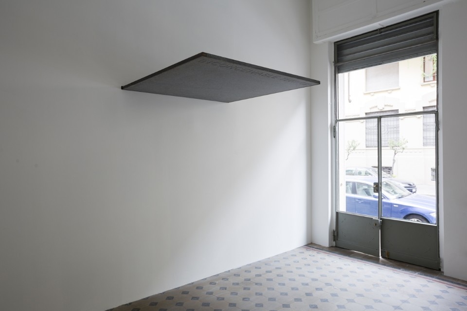 Lo spazio al numero 4 è diviso da una nuova parete che crea due locali separati. In ognuno dei due locali è presente solo una lastra di granito, incastonata a un’altezza di 2 m e 30 cm. Sulla lastra è incisa una scritta tratta da un pensiero di Susan Sontag (unremitting banality and inconceivable terror). In questa definizione – “interminabile banalità” e “inconcepibile terrore” – l’intellettuale americana sintetizza e profetizza la descrizione della nostra epoca. Francesco Arena dà forma al concetto espresso da Sontag attraverso questa scultura che divide e unisce al contempo i due ambienti dello spazio espositivo.