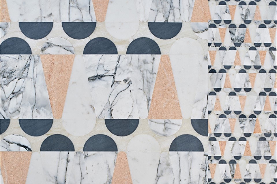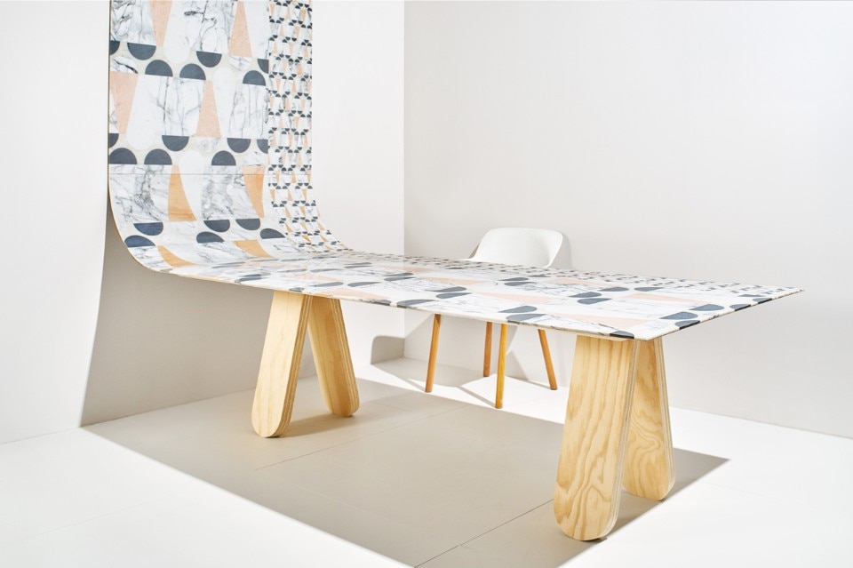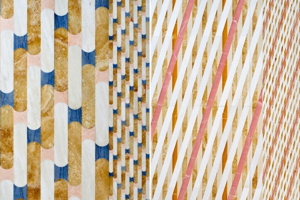 Il rivestimento in marmo Bianco Sivec, Bardiglio, Bianco Carrara, Rosa Portogallo e salmone, che prima era a parete, si svolge fino a diventare un piano, una seconda pelle, un tavolo sorretto da gambe a biscotto in Pino cileno. I cinque motivi in cui si declina la collezione condividono i colori dai toni pastello dei materiali e gli inserti di onici sfumati rosa e acquamarina.