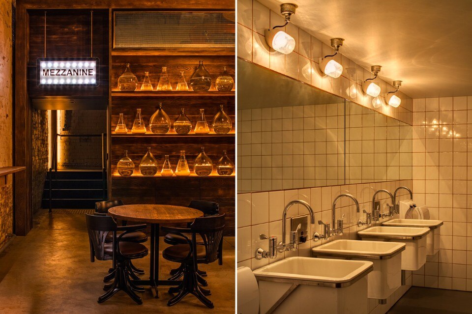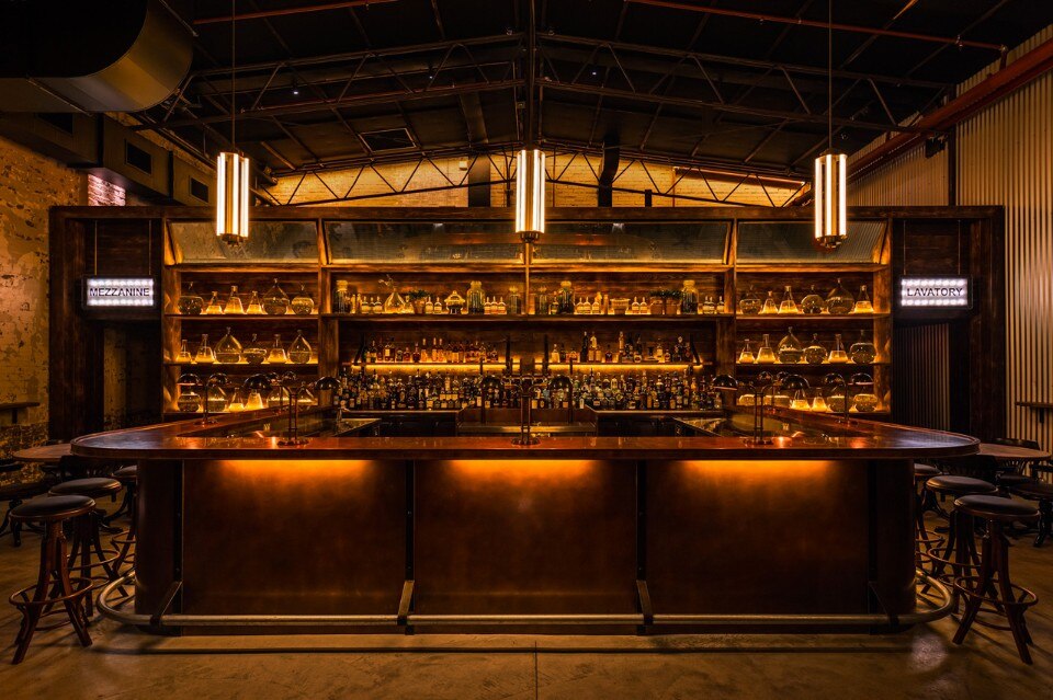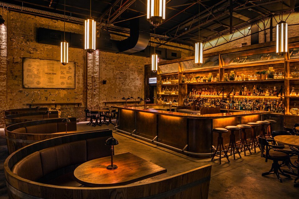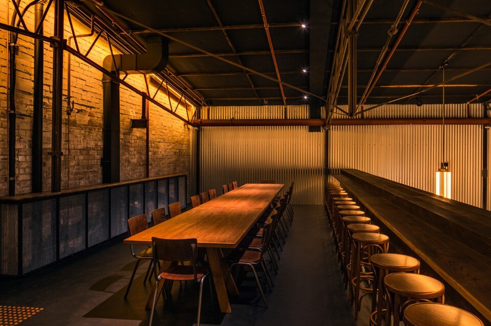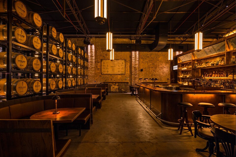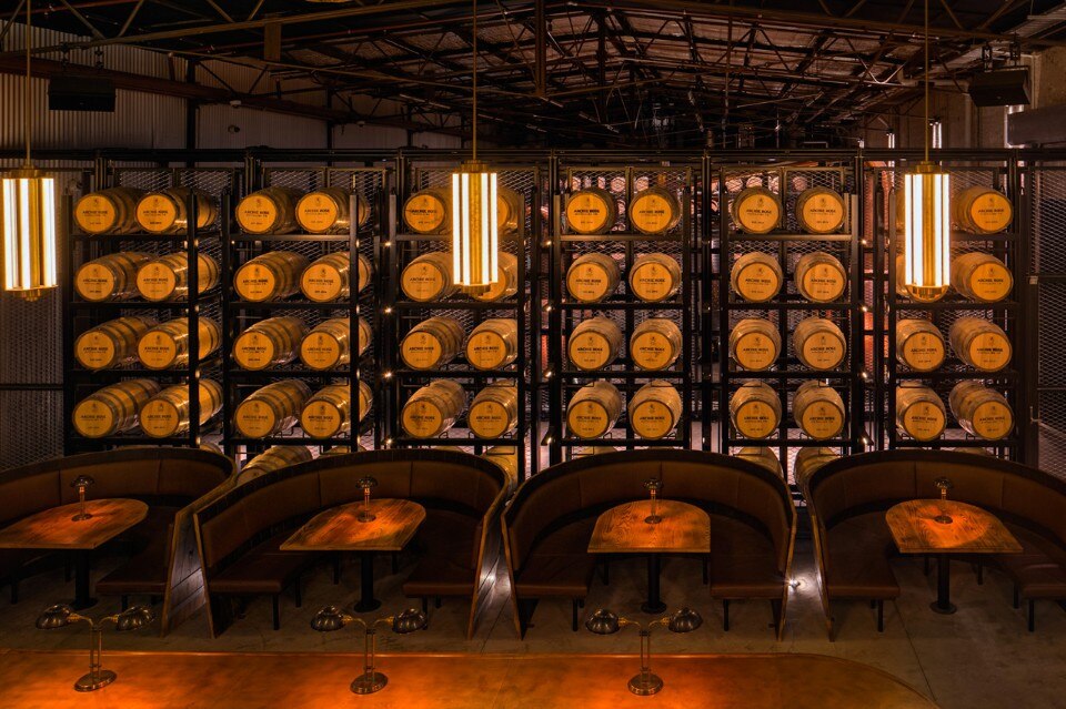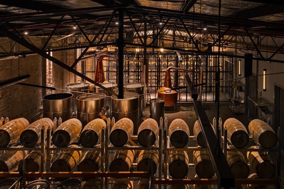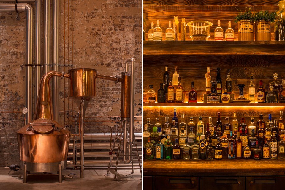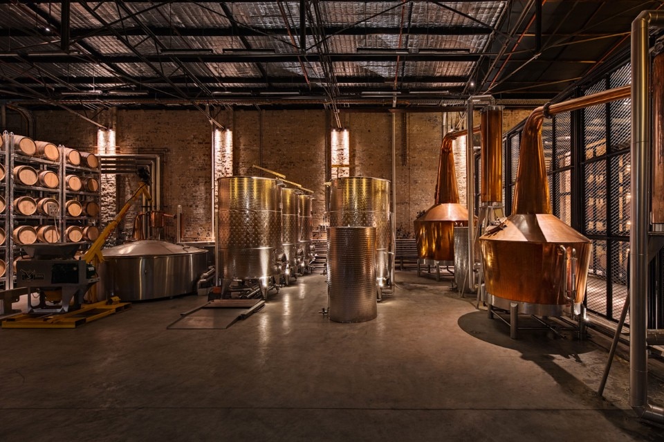 Velata da una lastra di lamiera stirata, la zona di distillazione è punteggiato da luccicanti attrezzature in rame e acciaio inox, mentre il bar è accompagnato da botti di rovere. Un soppalco che si affaccia sul bar e sulla distilleria crea una piattaforma di osservazione che estende le attività di degustazione e diidattiche.