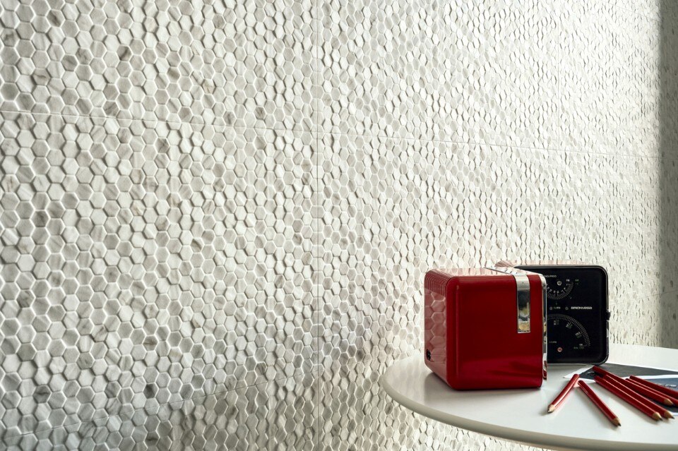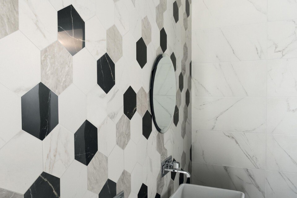 Accanto alle lastre in versione naturale, i Marmi Reali Matt presentano delle nuove declinazioni, che giocano con la tridimensionalità e i pattern geometrici: le tessere mosaico esagonali della versione Esagonetta, la matericità millerighe di Velvet e quella più decisa di Linea; il pattern Ottagono che si sviluppa abbinando importanti tessere di forma ottagonale e Esagono Mix, che gioca sulla composizione di esagoni in Marmo Reale matt e lucido in più varianti.