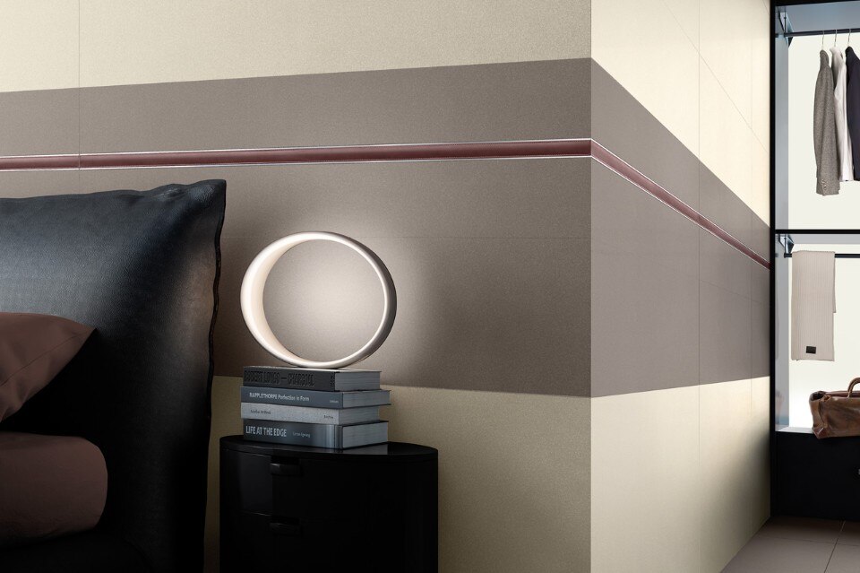 La texture della lastra – in gres porcellanato – è frutto della fusione di tre materiali diversi (vetro, pelle e tessuto) che genera un effetto multisensoriale: la percezione finale risulta alla vista calda e accogliente mentre da una distanza ravvicinata si apprezza il suo aspetto tattile.