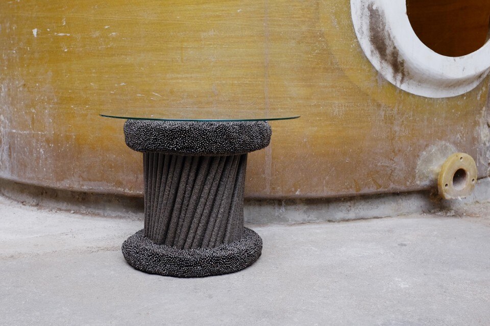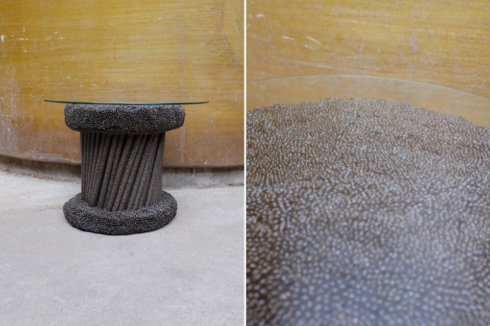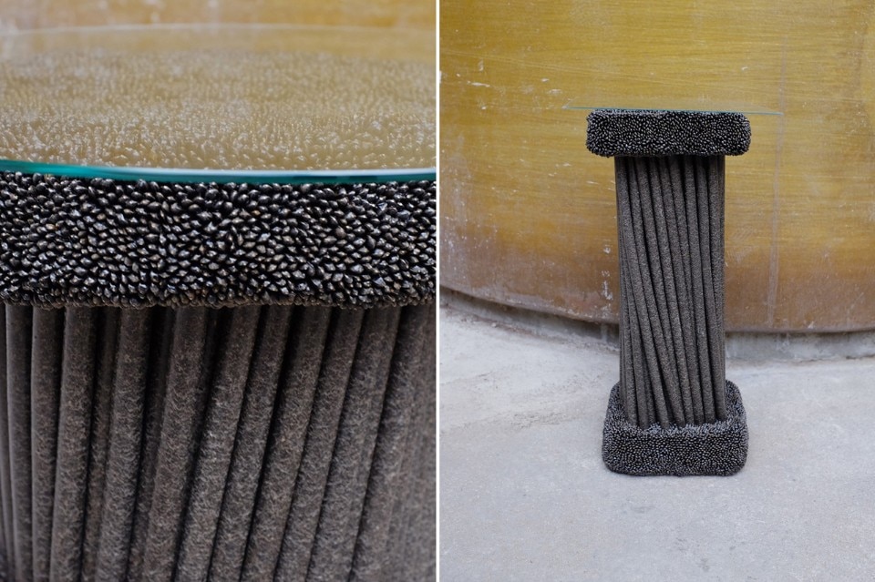 La sfida di questo progetto è stata quella di lavorare solo con i materiali dell’azienda: la cera d’api è stata trovata sotto un tetto dove le api avevano costruito i loro alveari. Una volta realizzata la base dei tavoli, le due estremità inferiore e superiore sono state rivestite di semi di girasole per ricordare da dove proviene il materiale utilizzato.