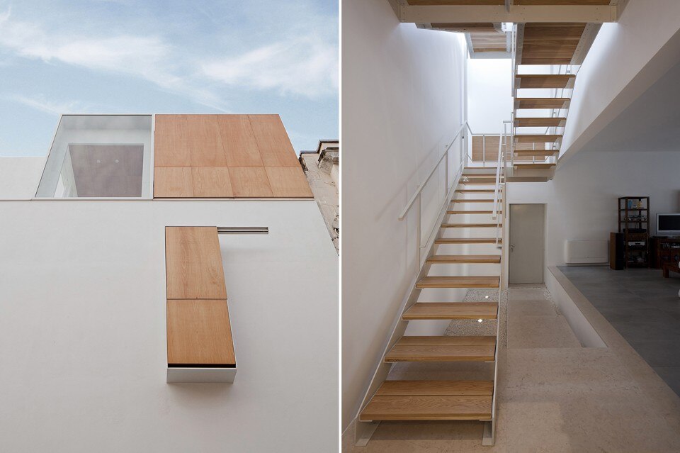 Casa CS quindi si chiude e si solleva dalla quota zero: la facciata a est è completamente cieca nel primo piano mentre quella a sud è stata arretrata e interrotta da brise-soleil, illuminando l’interno e dotando lo spazio di una piccola pertinenza verde. Altra fonte di luce è il vano scala: una struttura in acciaio e legno, leggera e sospesa, che dalle ampie aperture all’ultimo piano conduce e illumina tutto l’interno fino alla zona giorno inferiore.