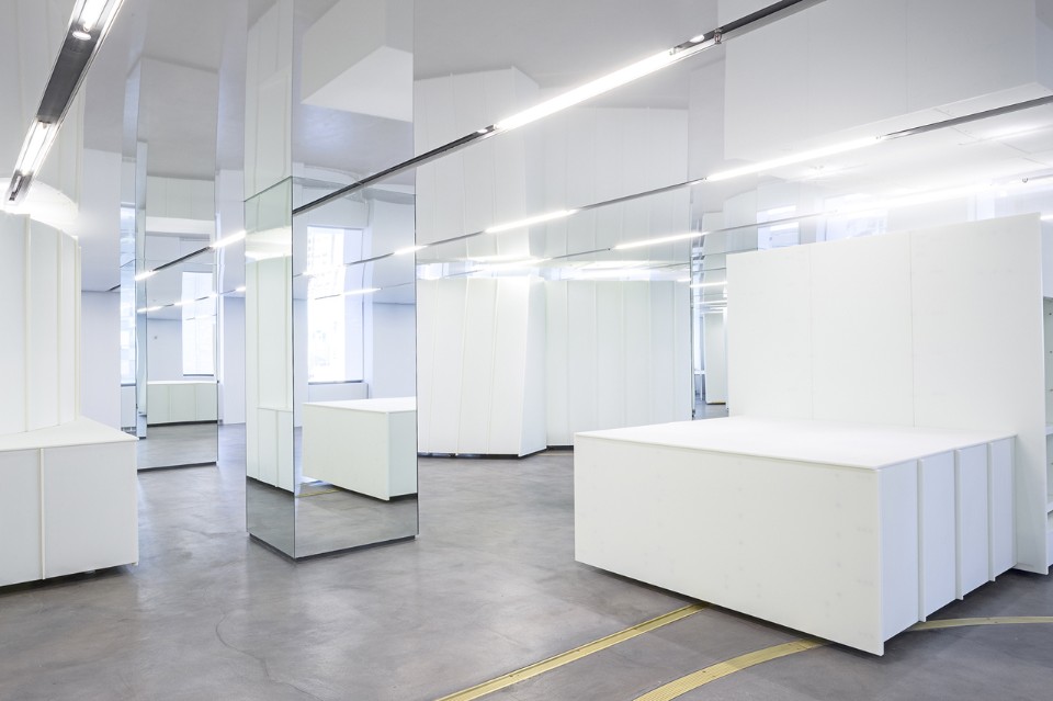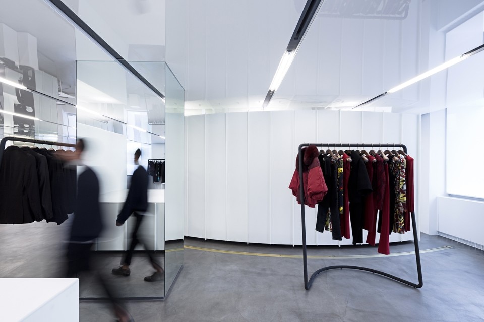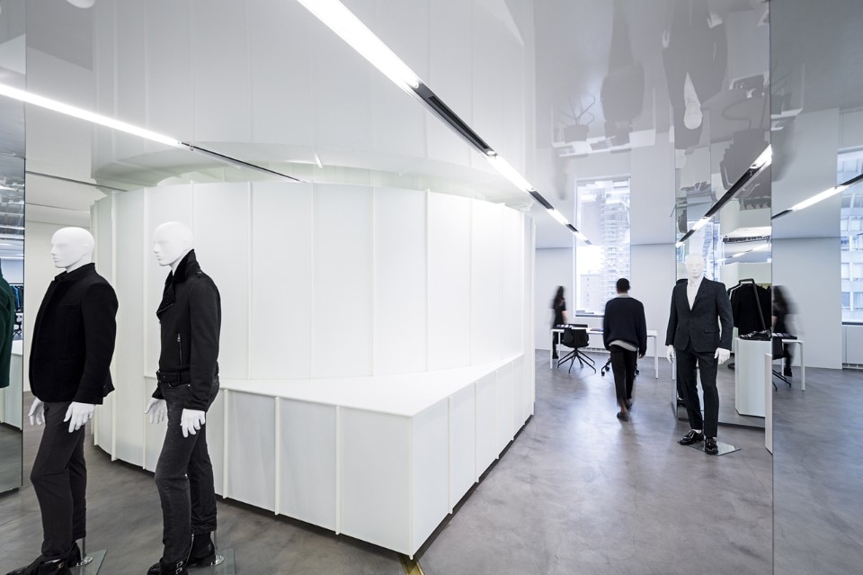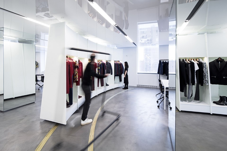 Per realizzare questa idea, SO – IL ha creato una serie di elementi espositivi mobili tridimensionali che rompono lo spazio e lo suddividono in ambienti più piccoli. La flessibilità del sistema di progettazione è al servizio del processo creativo, consentendo di esporre le linee liberamente e di ospitare riunioni e gruppi di lavoro di diverse dimensioni. Le strutture espositive sono guidate da un sistema ad incasso a pavimento con guide in ottone, grazie alla quali possono scivolare e ruotare attraverso lo spazio, e ridefinire continuamente l’ambiente e l’esperienza.