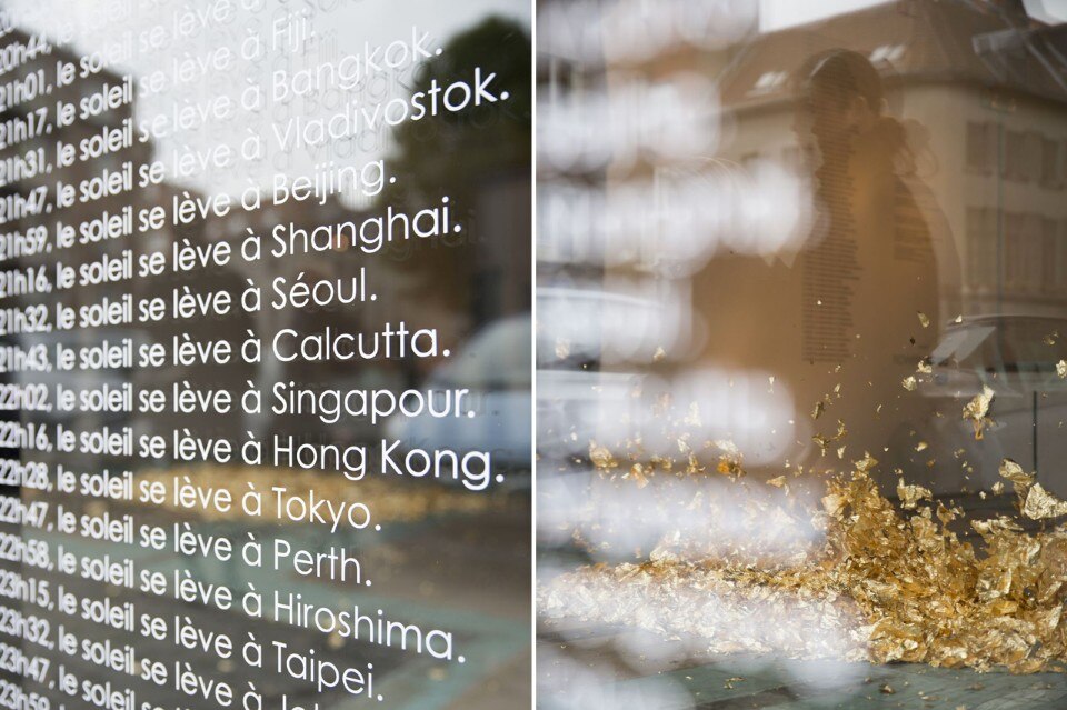 Per tre giorni e tre notti, seguendo il calendario delle albe nelle città di tutto il mondo, un sistema sincronizzato collegato a orologio universale attiva potenti ventilatori che provocano un vortice in cui danzano migliaia di foglie d’oro saltare; rievocazione degli impalpabili raggi sole del mattino. Leggere come l’aria, le delicate foglie d’oro, quasi immateriali, galleggiano un momento, cercano un punto di appoggio in aria, esitano, e scendono volteggiando lentamente, posandosi delicatamente a terra in attesa de prossimo risveglio del sole.