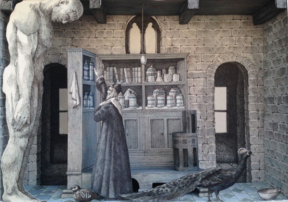 Vanni Cuoghi, Monolocale 30 (Melchisedech), 2015. 21 x 30 cm, acrilico, china e acquerelli su carta