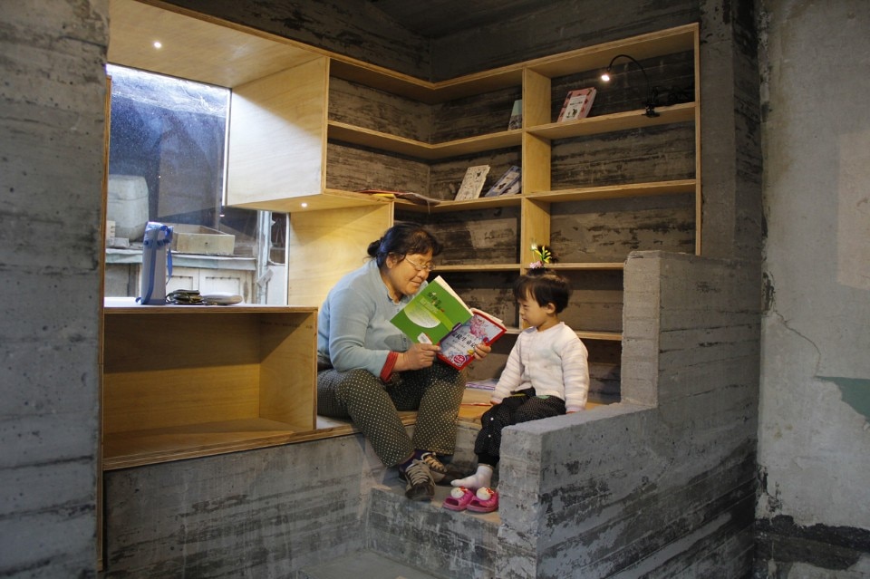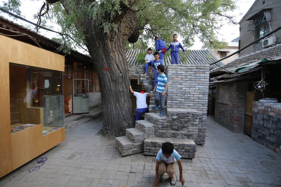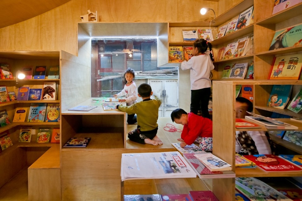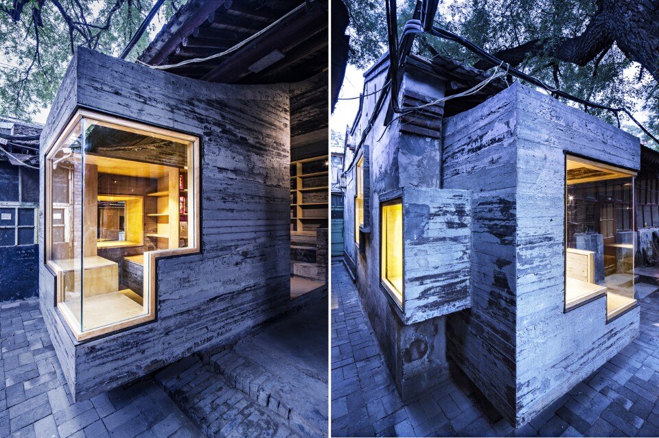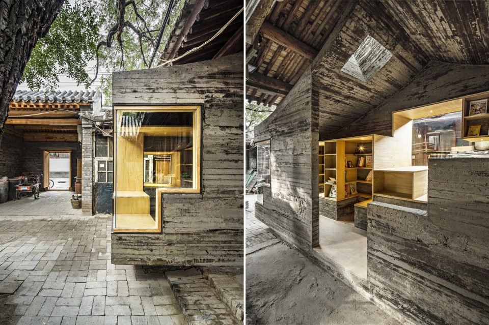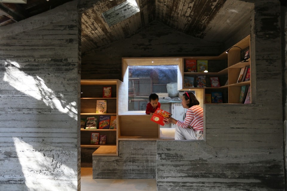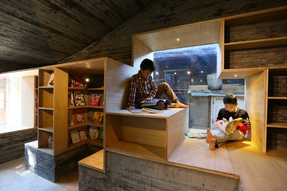 In collaborazione con le famiglie che vivono ancora nel cortile, è stata realizzata una biblioteca per bambini di nove metri quadrati, costruita in calcestruzzo combinato con inchiostro cinese e inserita sotto il tetto spiovente di un edificio esistente.