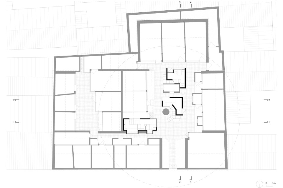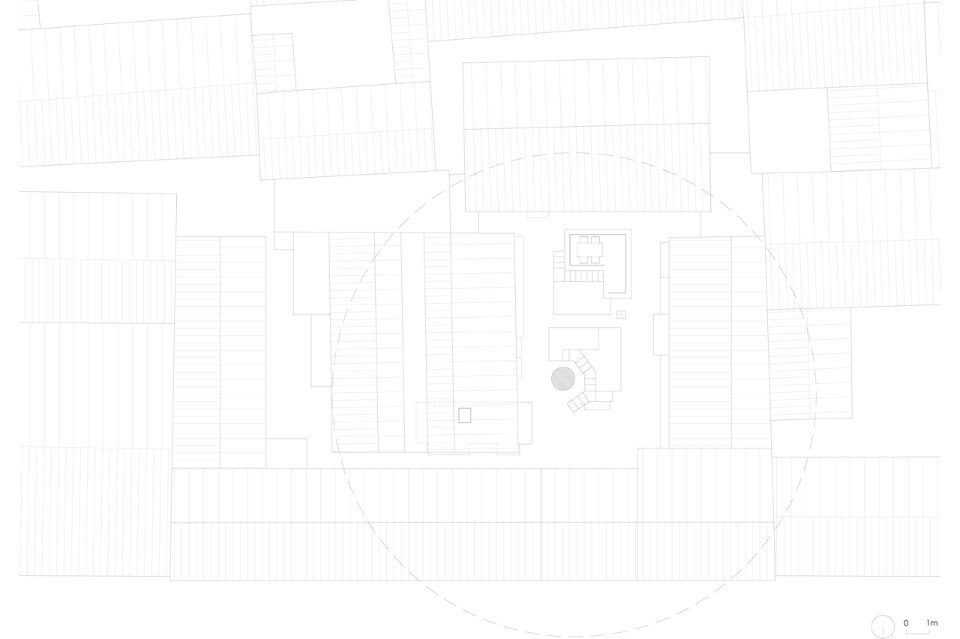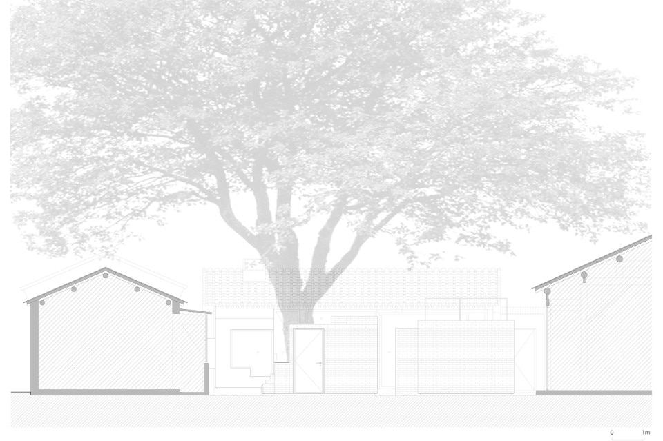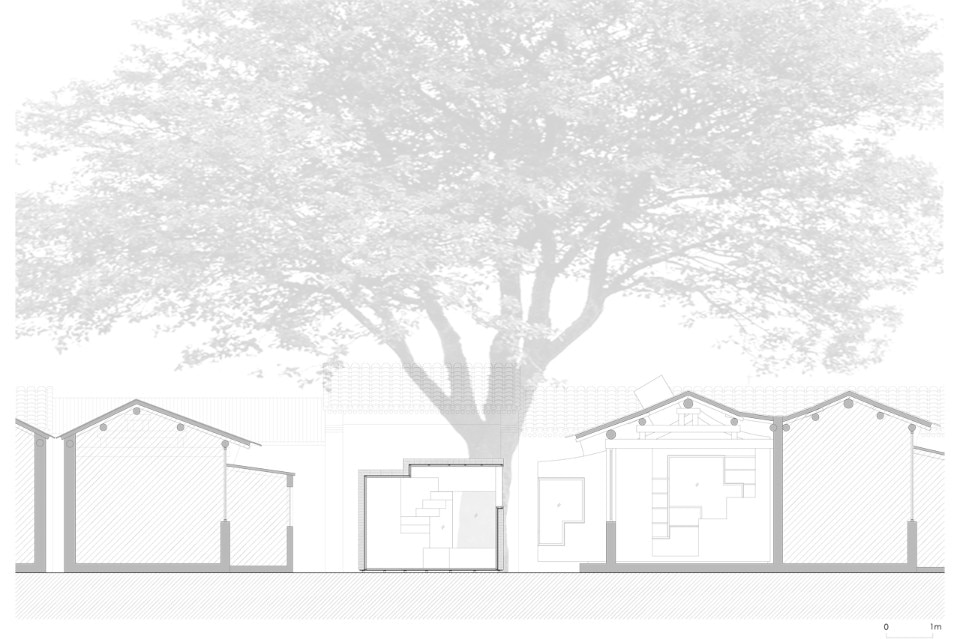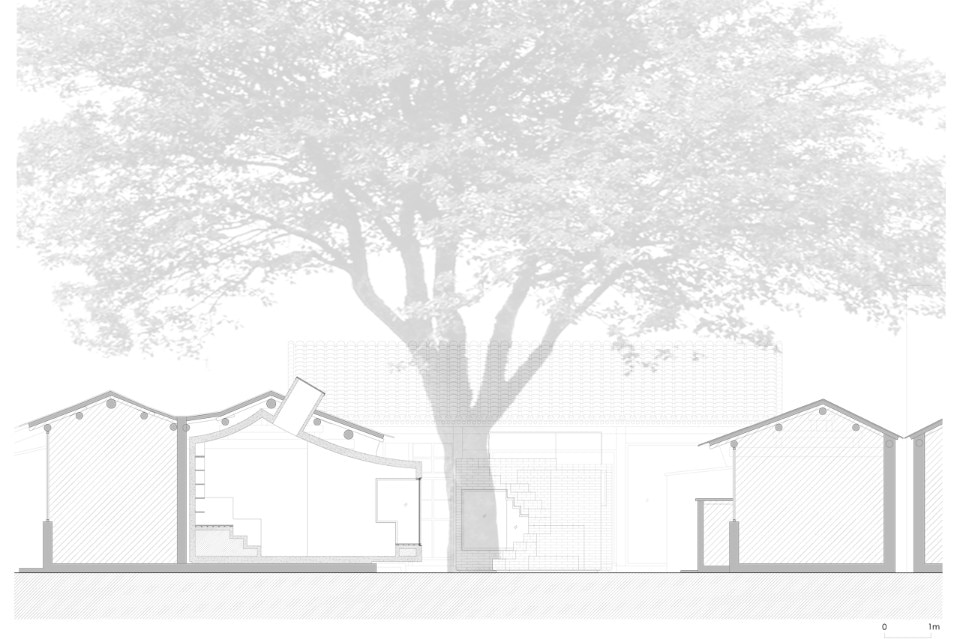 Sotto un grande frassino, una delle antiche cucine è stata trasformata in un mini spazio d’arte di sei metri quadrati, costruito con il tradizionale mattone grigio bluastro. All’esterno, un percorso di scale in muratura conduce al tetto, dove si è circondati dai rami e dalle foglie del frassino. Con questo piccolo intervento, gli architetti cercano di rafforzare i legami tra le comunità, oltre che arricchire la vita dei residenti locali. Un bambino può fermarsi dopo la scuola, scegliere un libro e leggere nella sua piccola nicchia prima di essere recuperato dai genitori. Oppure può salire sul tetto, sedersi all’ombra del frassino e conversare con gli anziani in uno spazio familiare, ma nuovo.