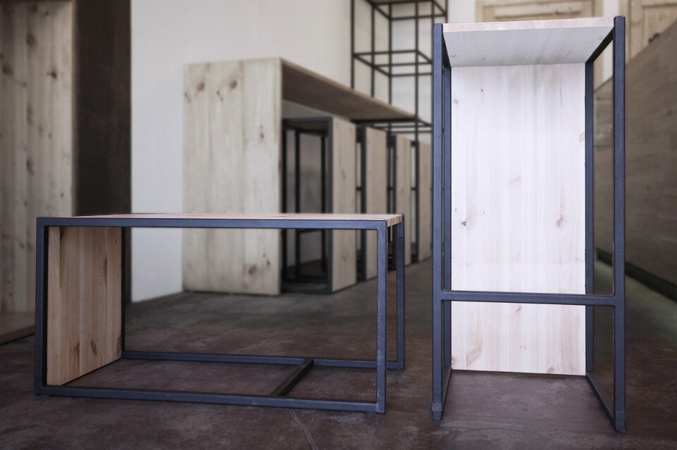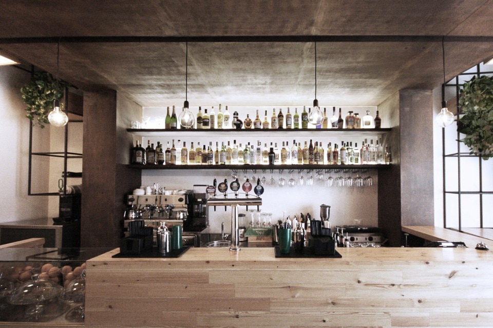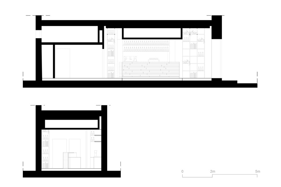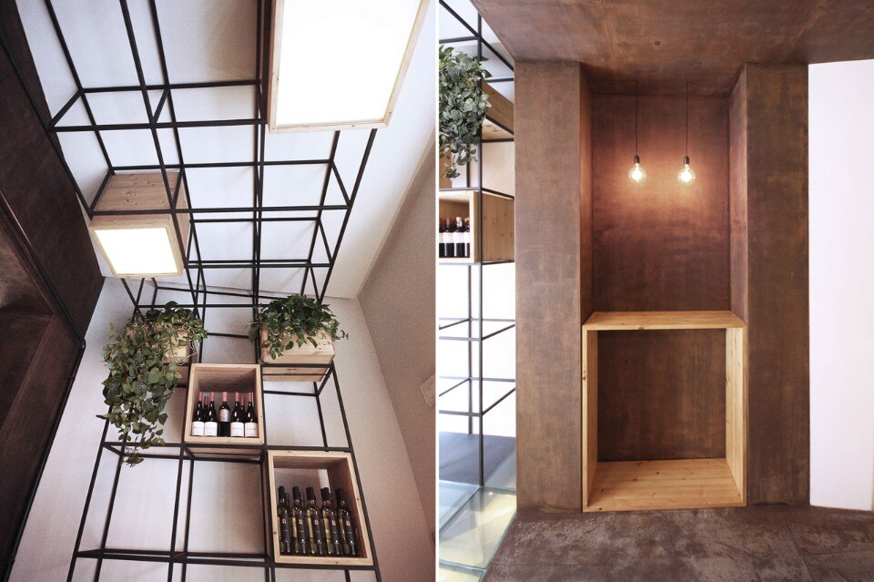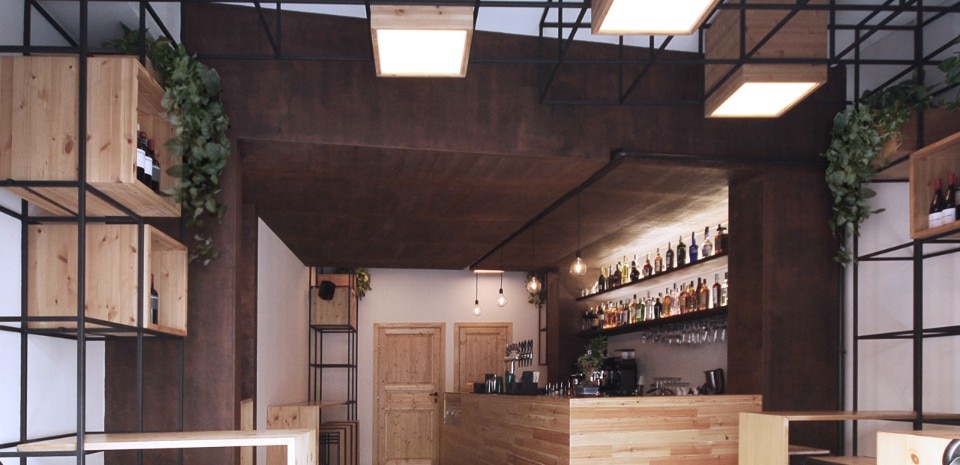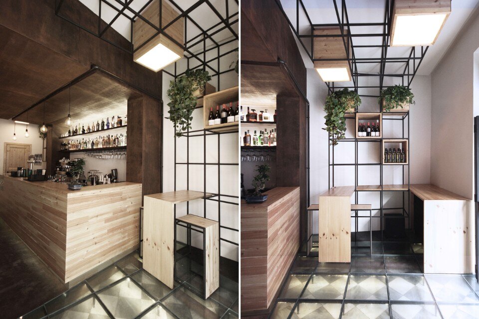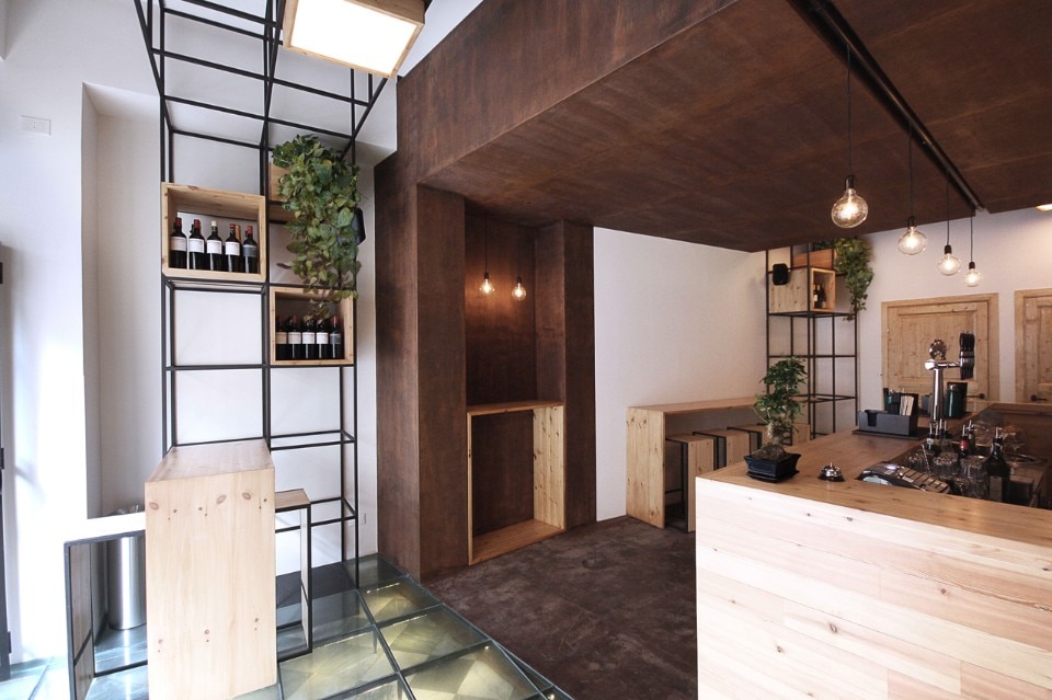L’ingresso del locale, piano unico a livello strada, si apre sulla zona caffetteria, dove gli arredi in legno – sedute, banchi e tavoli, oltre ad elementi contenitori, fioriere sulle pareti e corpi illuminanti pensili – sono concepiti come moduli innestati su una struttura a griglia in ferro, che dal pavimento sale su pareti e soffitto, marcando tridimensionalmente lo spazio.