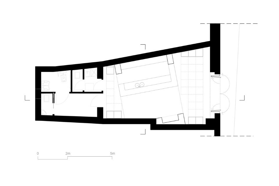 Nell’area centrale del locale, dove si concentra l’attività serale, irrompe un volume sbieco in ferro trattato color ruggine che abbraccia pavimento, pareti e soffitto e include il bancone bar, illuminato da luci soffuse a sospensione.