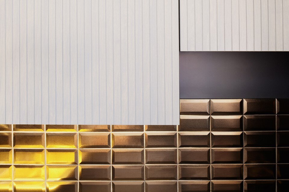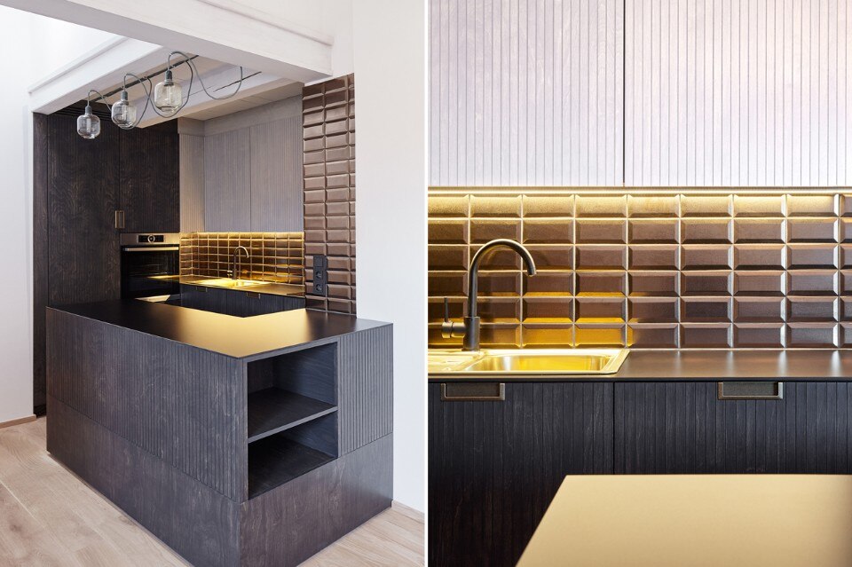 L’angolo cucina è di poco più grande, ma è stato sfruttato al centimetro con un mobile ad angolo dotato di un piccolo contenitore dietro la colonna usato per asciugare gli strofinacci. Tutte le parte visibili della cucina sono in compensato, la cui superficie è stata fresata a olio nelle tonalità del nero e del grigio. Il piano di lavoro compatto rispecchia nella sua finitura superficiale la ceramica che riveste il muro con una patina di ottone. Altri elementi in ottone sono le maniglie e il lavello. Le luci a sospensione sono di Normann Copenhagen. Tutta la cucina è stata realizzata da Dyzyk su disegno di Formafatal.