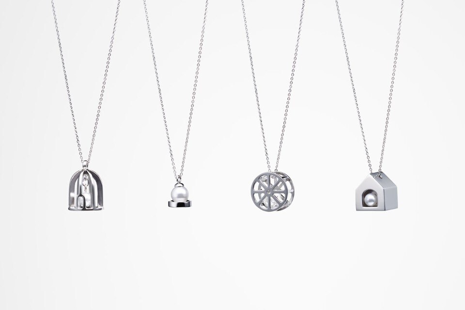 Una piccola perla interpreta la parte dell’animale domestico, ed è accoppiata a una gabbia per uccelli, una cuccia per cani, una cesta per gatti o una ruota per criceti canile in argento, oppure inserita all’interno di una boccia in acrilico: questo è il tema che unisce la collezione di gioielli disegnata da Nendo.