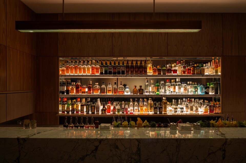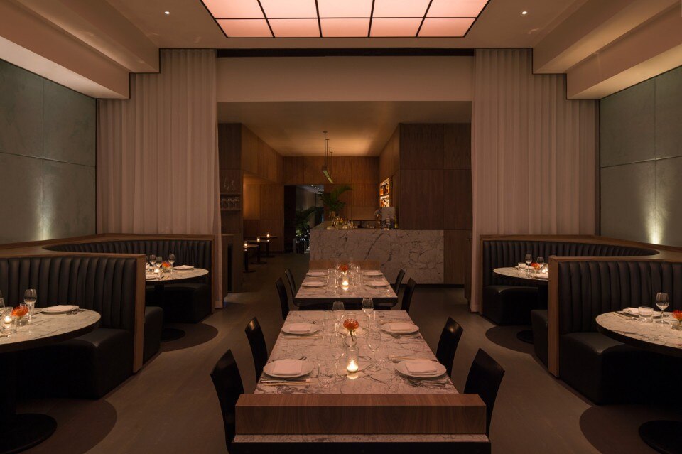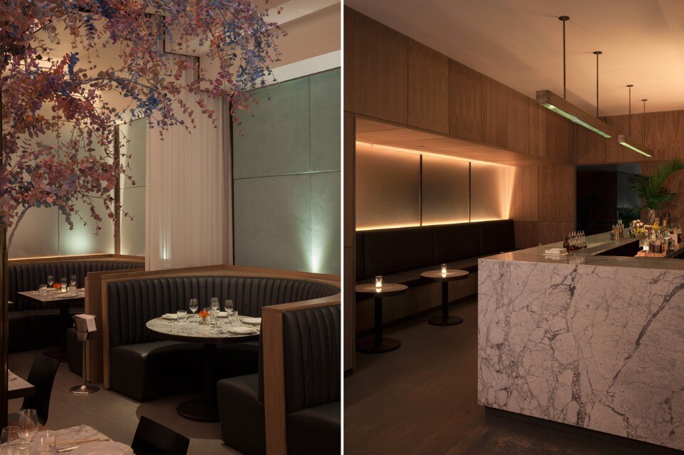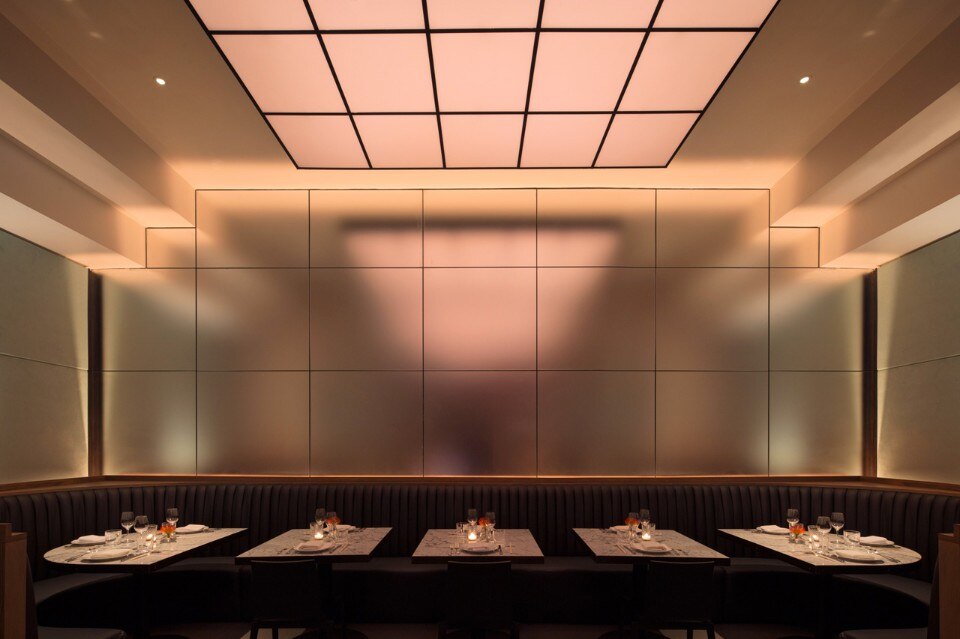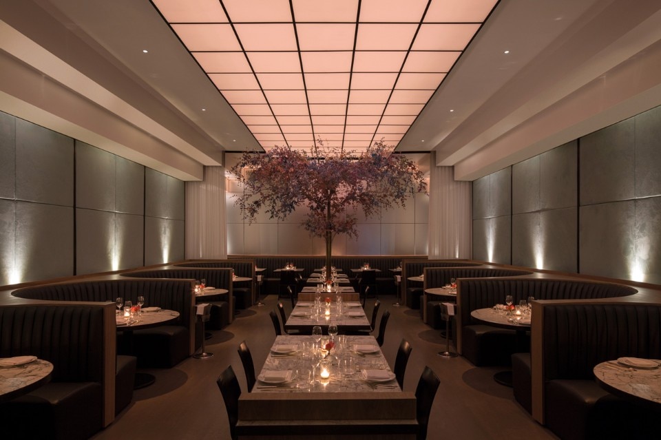 Sotto il bagliore ambrato del lucernario centrale, un albero astratto e scultoreao diventa il punto focale di questo ristorante progettato a New York da Rafael de Cardenas.