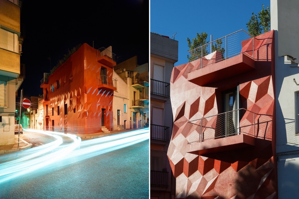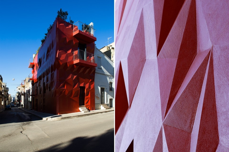 La facciata di Gentle Genius appare piatta in alcune parti che rappresentano la tranquillità e la gioia che la famiglia ha vissuto mentre altre, dove la superficie è più caotica, rivelano l’intensità di alcuni specifici momenti drammatici. Questa sequenza di estrema gioia e di profonda tristezza appartiene all’album In The Court Of The Crimson King dei King Crimson, e il rosso come la rabbia, la follia e la passione, si fonde con il blu come sentimenti di solitudine, tranquillità e tristezza.