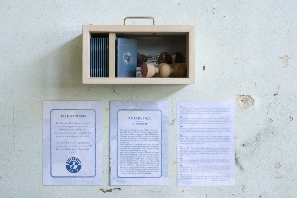 Il fulcro della mostra è il The Antarctic World Passport Delivery Bureau, un’installazione itinerante recentemente presentata al Nansen Initiative Global Consultation a Ginevra e al Grand Palais di Parigi nel corso del vertice sul clima COP21 delle Nazioni Unite. I visitatori dell’Antarctica World Passport Delivery Bureau, un assemblaggio architettonico realizzato con materiali di recupero, ricevono un Antarctica World Passport numerato, e in cambio si impegnano a sostenere i principi del progetto: ad agire contro gli effetti disastrosi del riscaldamento globale e a lottare per la pace. Dal 2008, sono stati stampati 55.000 passaporti e i visitatori della mostra di Lucy + Jorge Orta alla Jane Lombard Galleria saranno invitati a registrarsi per il loro passaporto personale, e a unirsi a questa comunità crescente di cittadini del mondo.