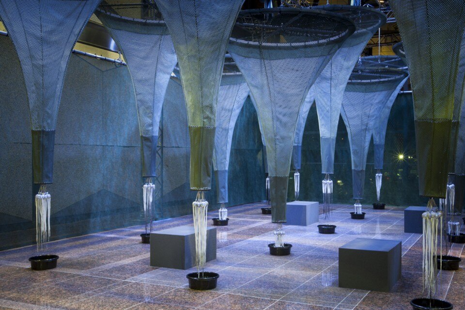 È un raffinato lavoro sulla tecnologia quello pensato da Moritz Waldemeyer per kayoubi. L’ingegnere e designer anglo-tedesco propone una installazione costituita essenzialmente da paralumi: applicando uno strato extra di pellicola ad una particolare variante forata di Alcantara, Waldemeyer ha creato una texture che, combinata alla luce, trasforma il materiale in qualcosa di ricco e prezioso. Ne risulta un effetto di grande fascino, evidenziato dal paravento che circonda l’installazione e definisce uno spazio emozionale privato.