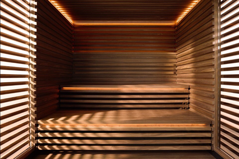 L’invisibilità della tecnologia è un principio fondamentale per Matteo Thun e Antonio Rodriguez, ed è il motivo per cui il riscaldamento della sauna è posizionato discretamente sotto la panca. Niente disturba la vista, ci si ritrova immersi nella luce e nel calore, in un ambiente rilassante.