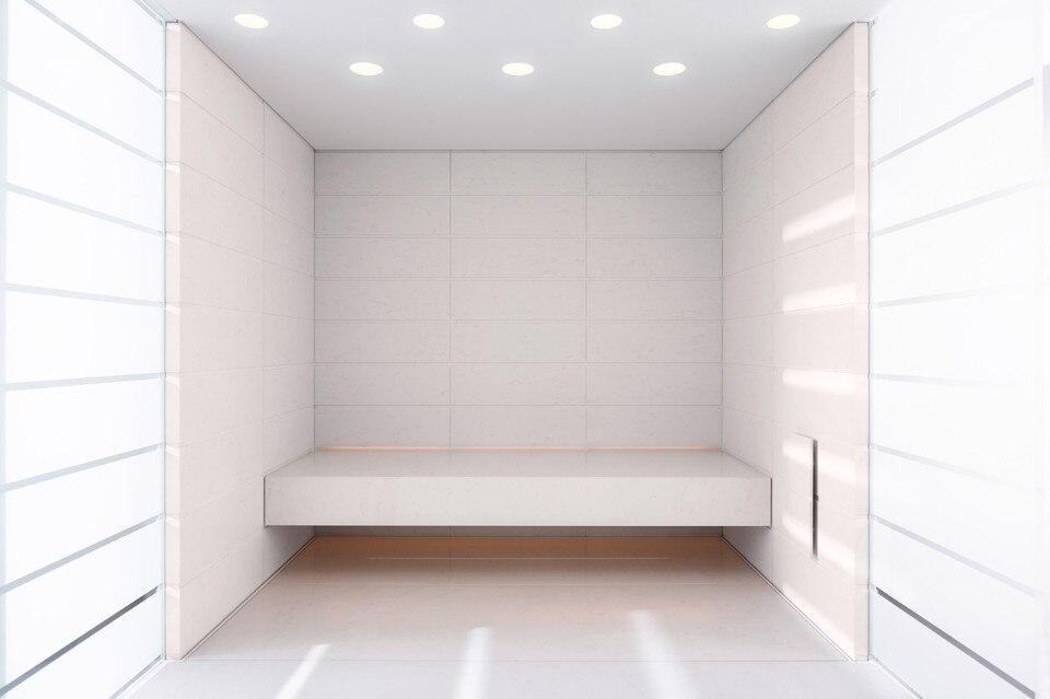 La creazione di paradiso terrestre ha ispirato il bagno turco, un ambiente bianco e puro con una parete in vetro satinato che cattura l’occhio, lastre opaline e pannelli sottili. Le pareti laterali e posteriori sono progettate con un agglomerato di quarzo impermeabile e continuano il disegno grafico del vetro frontale. Anche qui, il concetto dominante è quello della luce, mentre i faretti sono incorporati nel soffitto, creando la sensazione dei raggi solari.