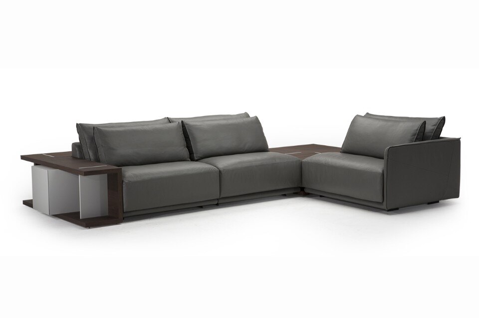 Tra i divani della collezione il modello Long Beach firmato da Claudio Bellini: un divano dalle forme morbide, decisamente moderno, presentato a Colonia nella versione sectional, con angolo e mobili terminali in legno (coffee table e libreria bassa), completamente integrati con il divano.