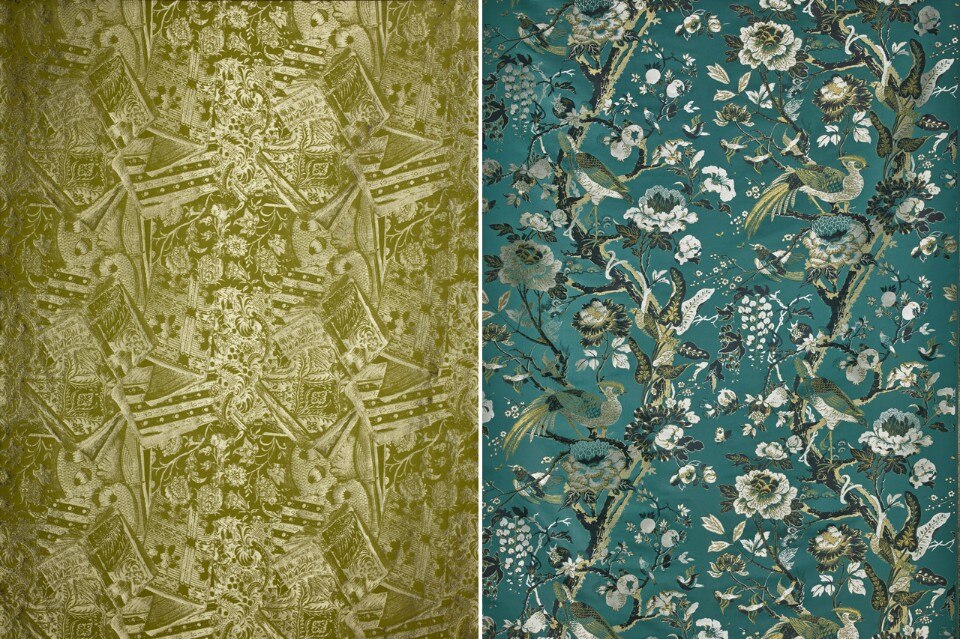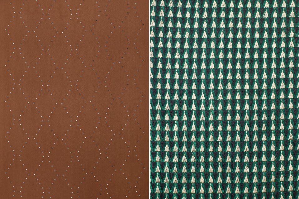 La varietà dei disegni manifesta la libertà di ispirazione: geometrie ricamate e stampate, disegni figurativi d’archivio, sottoboschi misteriosi e grafici, astrazioni di fiori fil coupé, citazioni classiche, paillettes, piercing, stampe metalliche a pigmento e un omaggio all’arte tessile di Anni Albers.