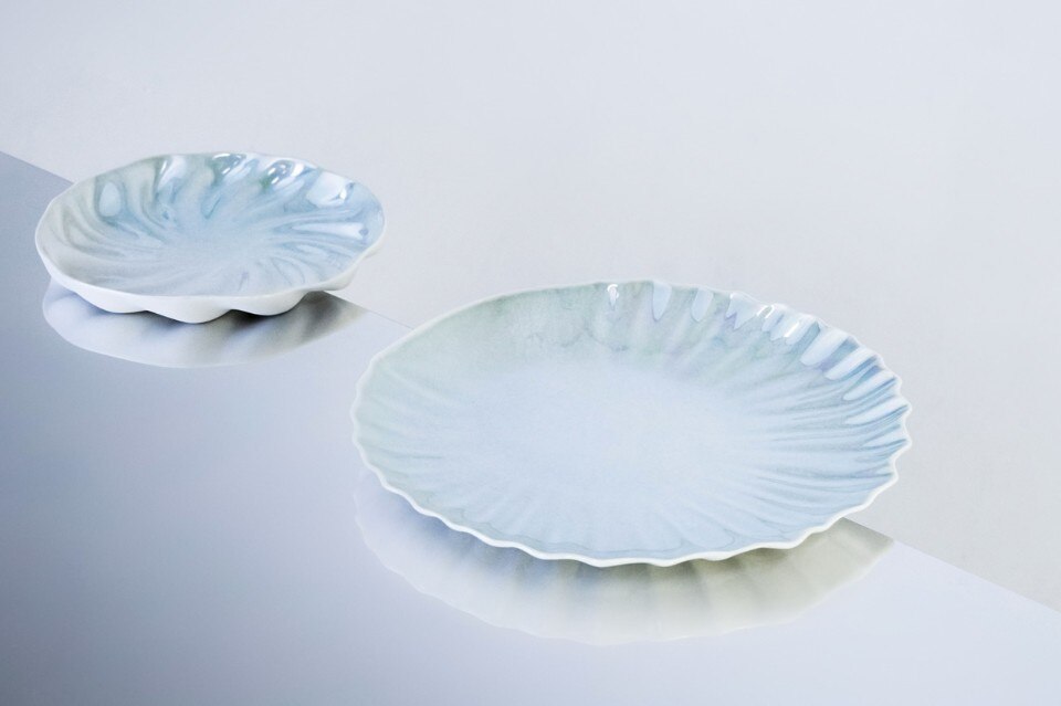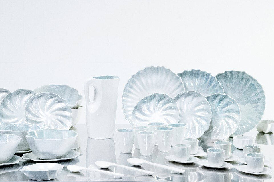 “La trasformazione di forme organiche e naturali in oggetti quotidiani è un approccio molto usato in passato ed è caratteristico del movimento europeo Antrs and Crafts. La porcellana della serie bianca è la White Southern Ice, mentre quella della serie grigia è la WSS, entrambe prodotte in Australia. Entrambi condividono una finitura perlata che ricorda la madreperla e le conchiglie”.