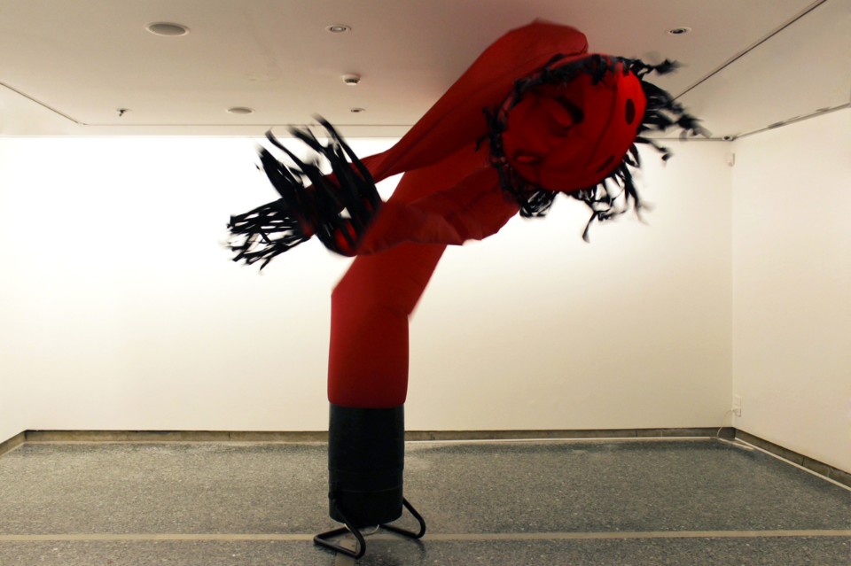 L’oggetto readymade diventa performer nell’intervento di Davide Sgambaro che conclude la mostra. Un grande skydancer, pupazzo gonfiabile utilizzato in spazi aperti per scopi promozionali, recuperato dall’artista da un’azienda fallita, è installato all’interno dello spazio espositivo a rappresentare con ironia e con un forte impatto visivo e sonoro la condizione dei giovani artisti; la sproporzione rispetto allo spazio rende il corpo in movimento goffo, o ancor più grottesco, palesando l’inadeguatezza rispetto al contesto in cui è inserito, mentre il “performer” arricchisce il senso portando con sé la sua vicenda “personale”.