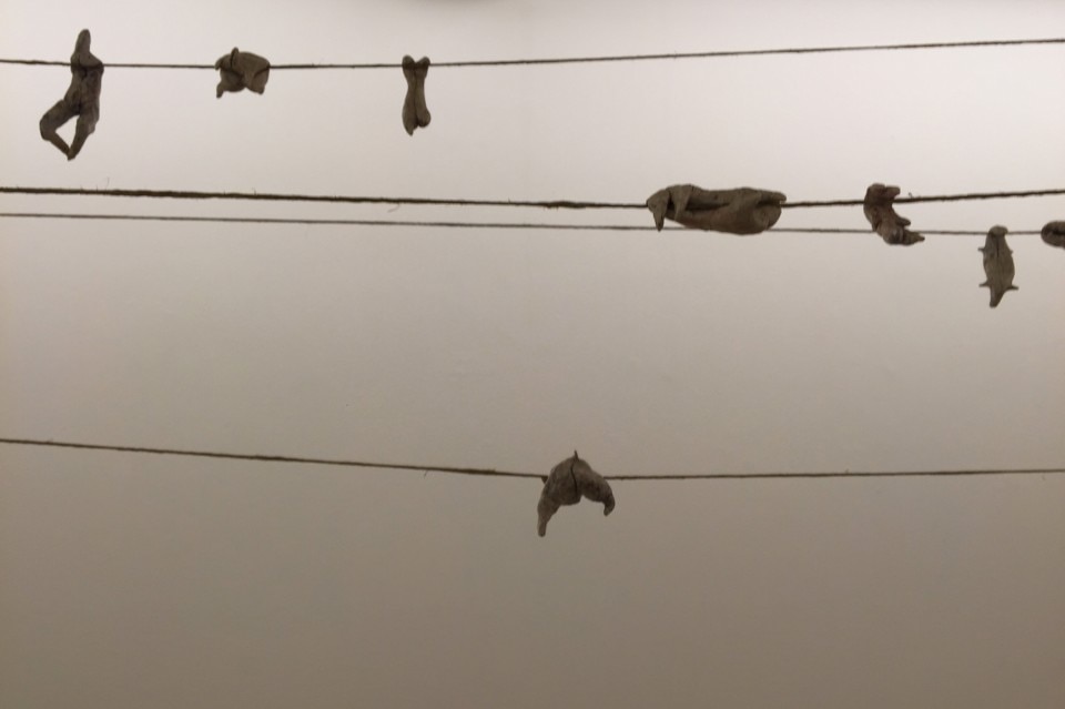 Enej Gala, attraverso la sua opera scultorea e installativa dove una serie di corpi informi, molli, è appesa stancamente a dei fili, induce lo spettatore a una riflessione critica sul concetto di “aiuto” e alle problematiche che spesso ne impediscono l’efficacia: l’attenzione mediatica così frequentemente deviata verso chi aiuta, la paura di aiutare, la pigrizia individuale che porta a delegare al “sistema” la risoluzione dei problemi sociali emergenti.