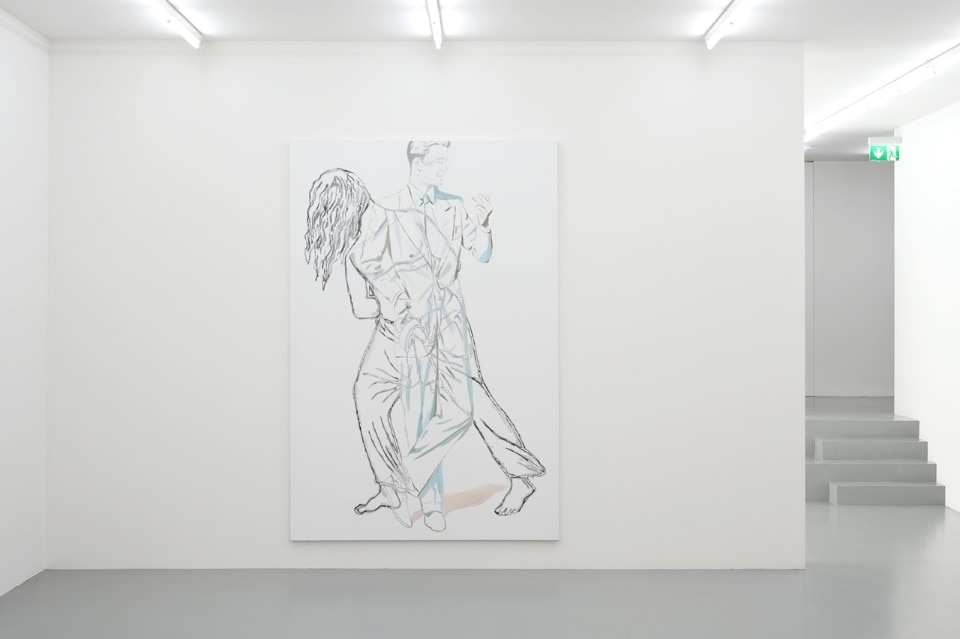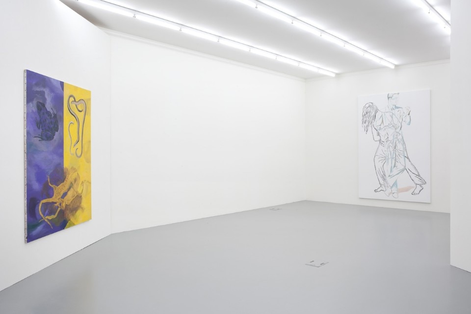 Sulla parete d’ingresso della galleria sono esposti 6 manifesti in cui l’artista esplora e riedita il suo stesso immaginario. Alcuni elementi particolarmente iconici sono estrapolati dai dipinti e rivisitati con spirito pop e grafiche vintage. Uno di questi è dedicato a Il gatto di Schrödinger, dando vita a un enigma metaforico sul ciclo di vita e morte della pittura e quindi ulteriore riferimento all’artista.
