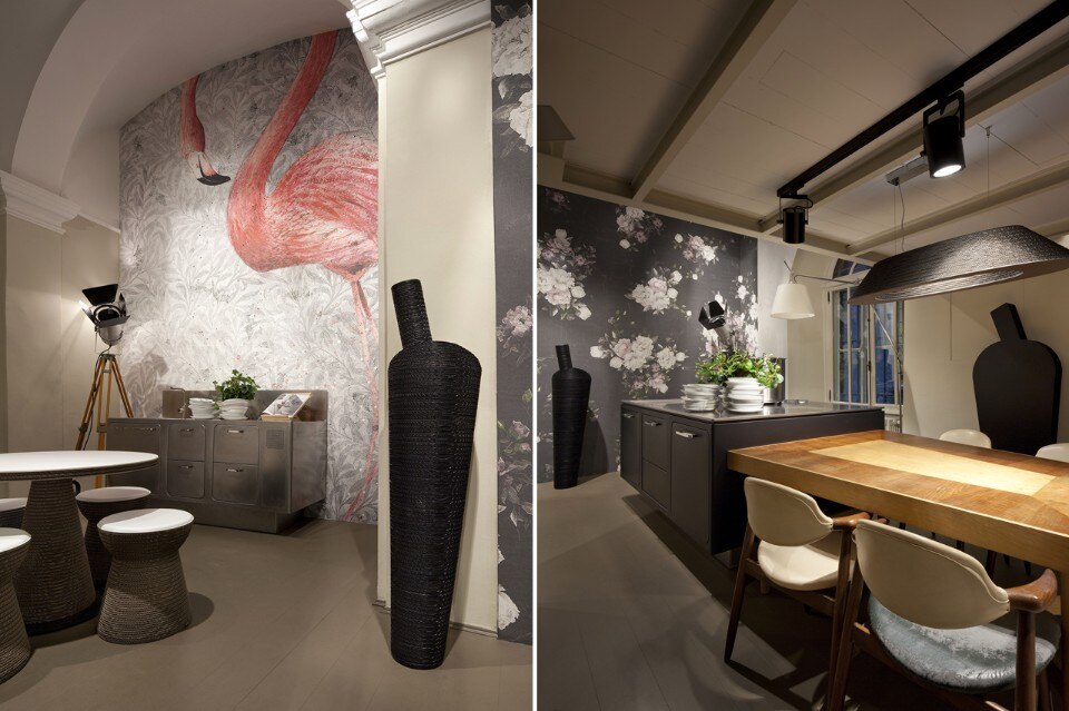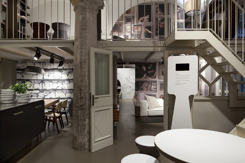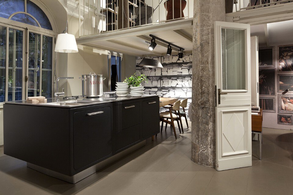 Di fronte, un altro blocco Ego è invece interamente in acciaio: sembra una madia che si inserisce perfettamente in un ambiente che supera la tradizionale divisione degli ambiti per proiettare uno scenario fluido, contemporaneo.