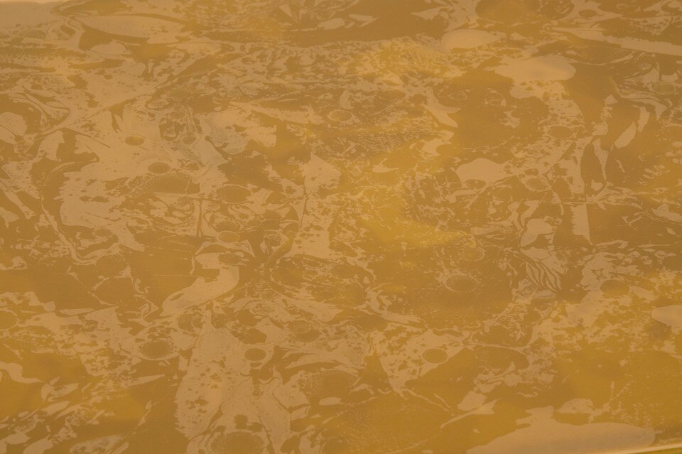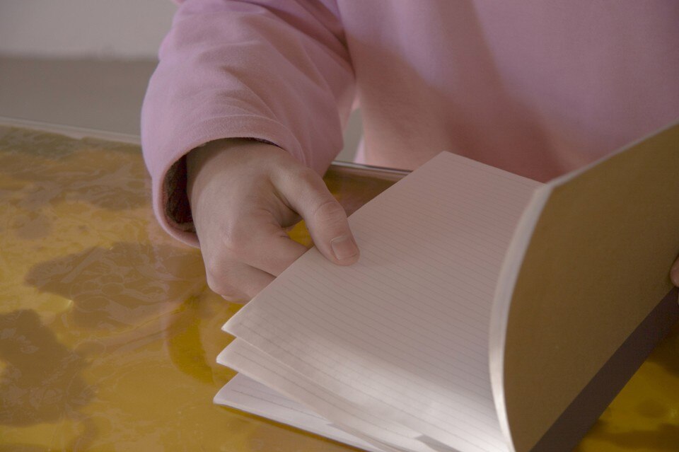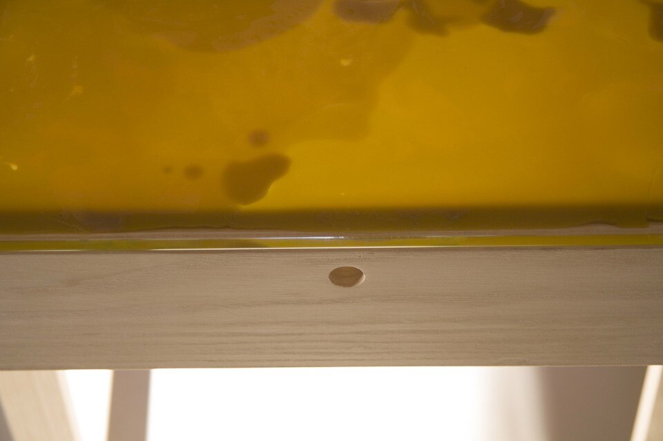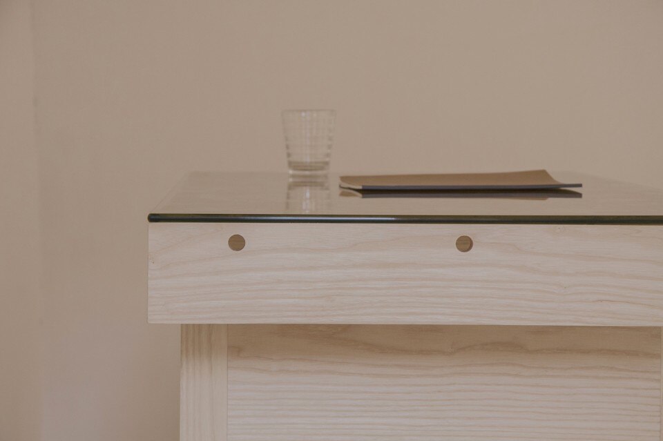 La cera è stata versata sulla superficie inferiore di una lastra di vetro, sopra un piano di legno a cui le gambe sono state fissate dall’interno. Così la cera rimane a vista, la sua fragranza si diffonde attraverso i piccoli fori sul lato del piano e assolve la funzione di fissare il vetro in direzione orizzontale. La struttura in legno, progettata per enfatizzare la superficie colorata dorata, separa il piano del tavolo in tre parti: due contenitori laterali e uno spazio centrale per lavorare, mentre il profumo caratteristico della cera d’api si spande fuori dai fori e avvolge le persone sedute attorno al tavolo.