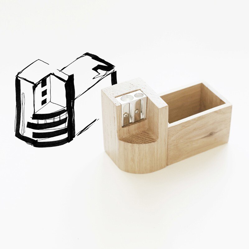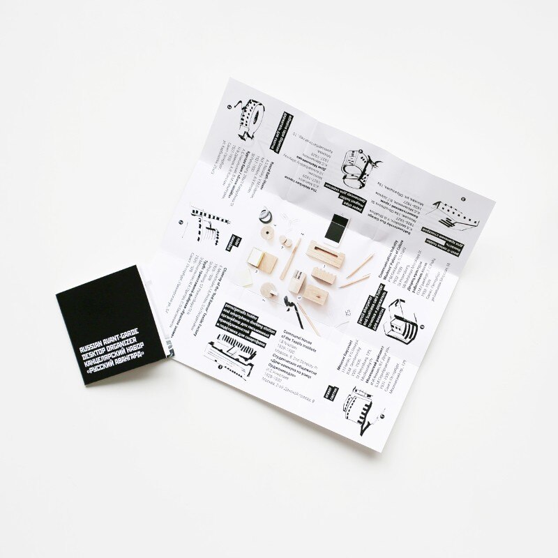 Il set è composto da dieci elementi, ciascuno con una propria funzione (temperamatite, righello, docking station per smartphone, supporti per biglietti da visita, post-it e gomme, supporto magnetico per graffette, dispenser di nastro adesivo, portapenne) e ciascuno corrispondente a una famosa architettura dell’avanguardia russa – la Melnikov House, la stazione degli autobus di Bakhmetevsky, il Palazzo della Cultura dei Lavoratori della Comunicazione, il Raysoviet di Mosca, la casa comunale dell’Istituto tessile e la ciminera della fabbrica tessile Bandiera Rossa.