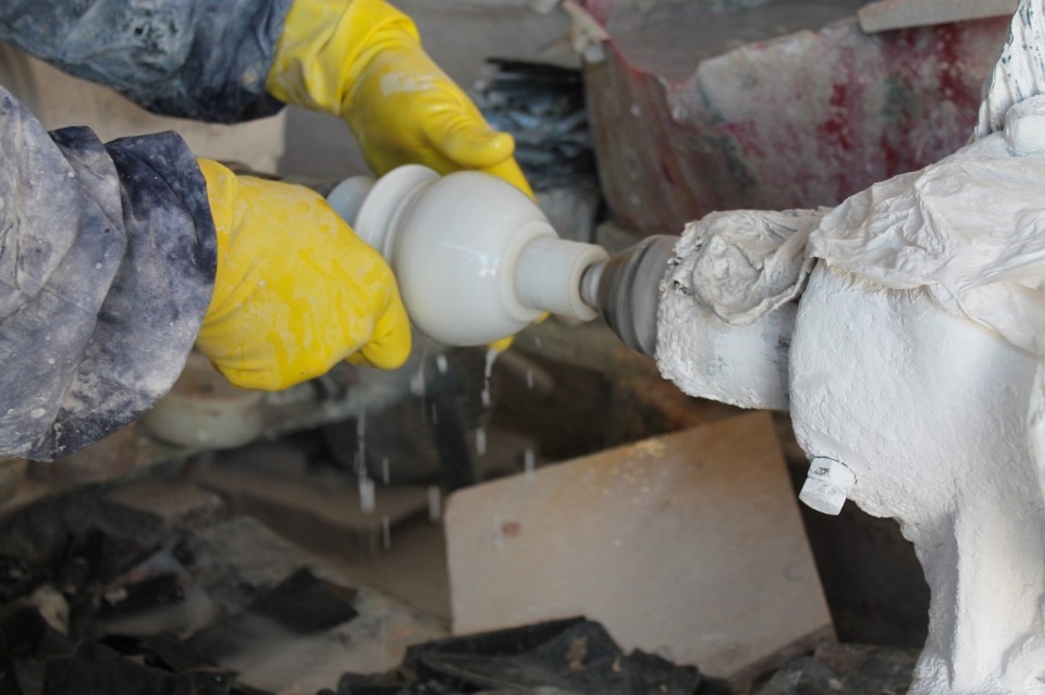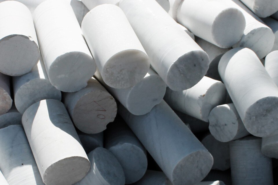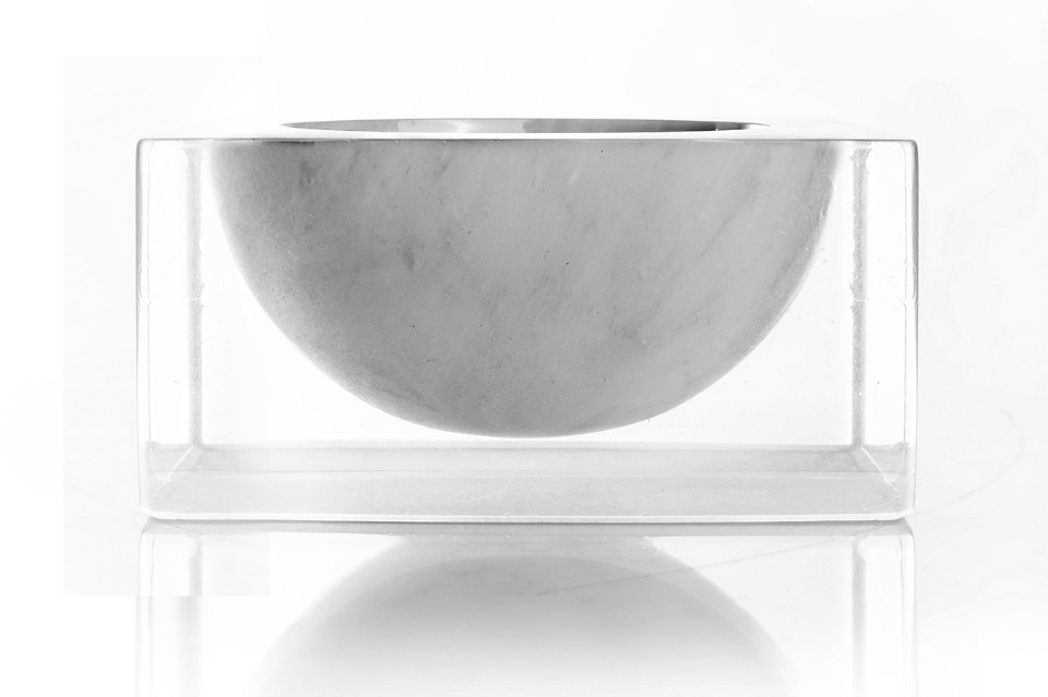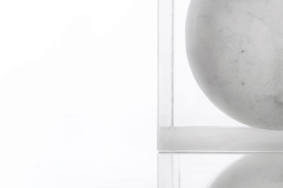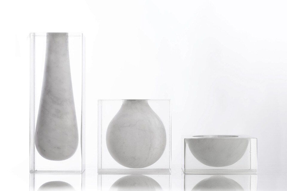 Con un tornio e il saper fare artigiano Moreno Ratti trasforma gli scarti del carotaggio del marmo in una collezione di oggetti sospesi nella resina, astrazione del materiale scartato.
