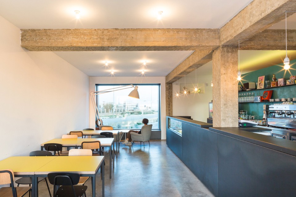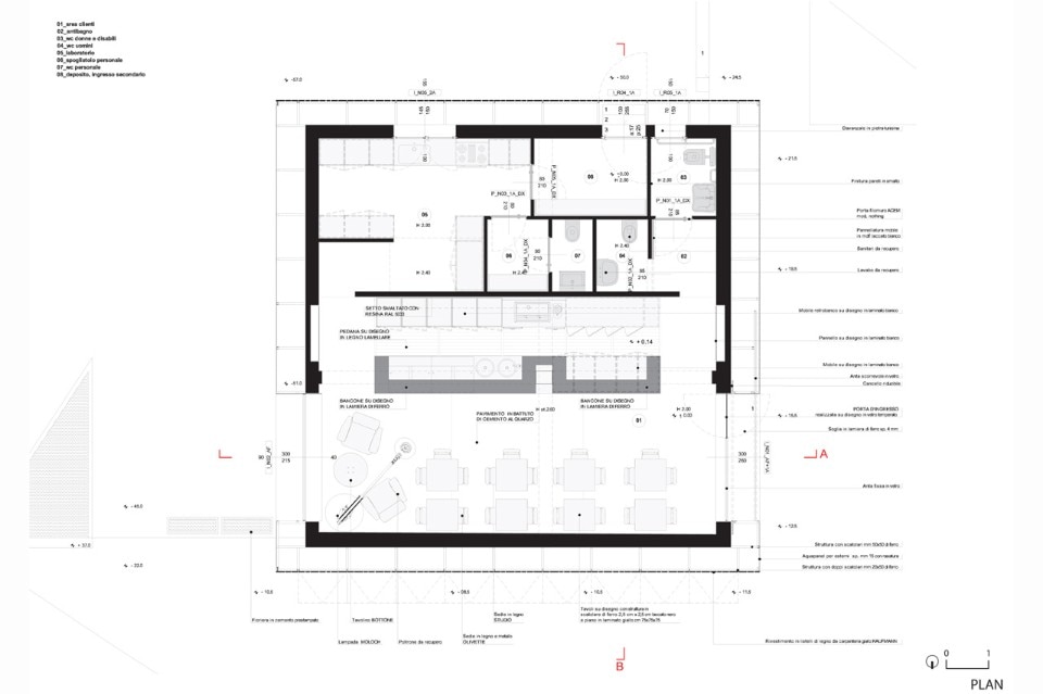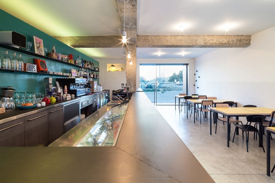 All’interno una quinta smaltata in resina poliuretanica verde divide la zona di lavoro da quella aperta alla clientela. Le travi e i pilastri sono lasciati in calcestruzzo a vista e il pavimento è in battuto di cemento industriale lisciato e trattato con resina trasparente. Il bancone, come un volume pieno, è realizzato in lamiera di ferro mentre tutti gli arredi rimandano a stili vintage retrò.