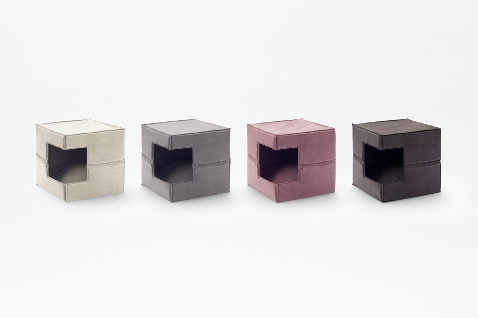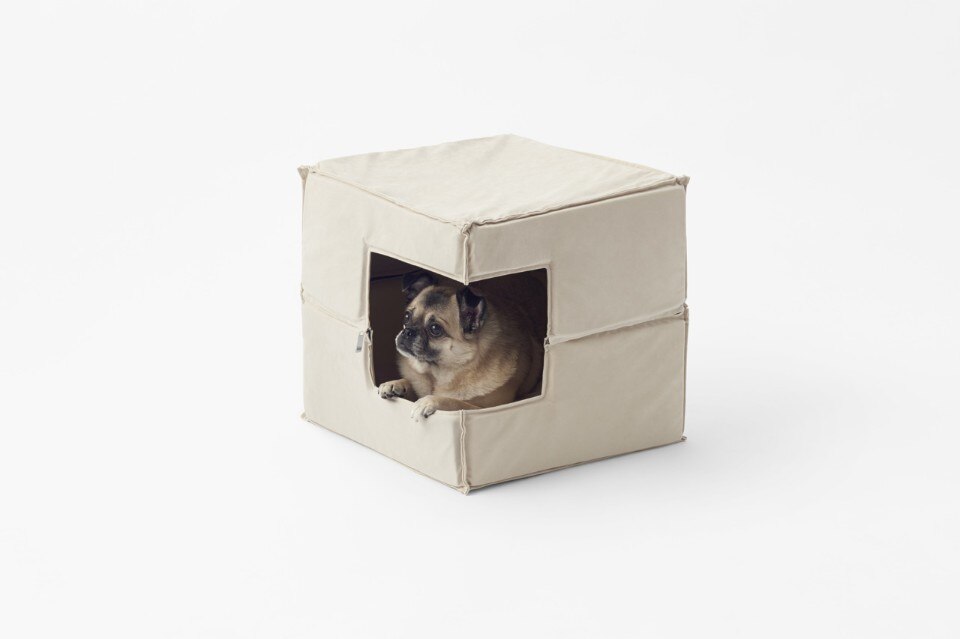 Nendo, cubic pet goods, by | n. Una cuccia a forma di cubo composta di due parti, una superiore e una inferiore, collegate tramite una cerniera. Quando la parte superiore viene schiacciata verso il basso, la cuccia può essere usata come un letto. Disponibile in quattro colori, due dei quali possono essere combinati