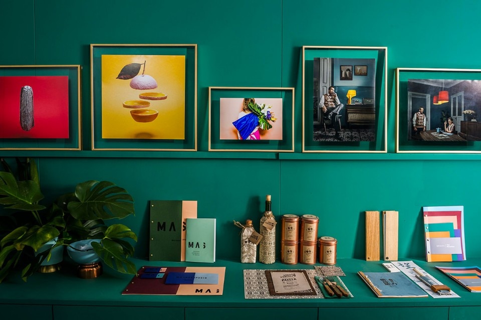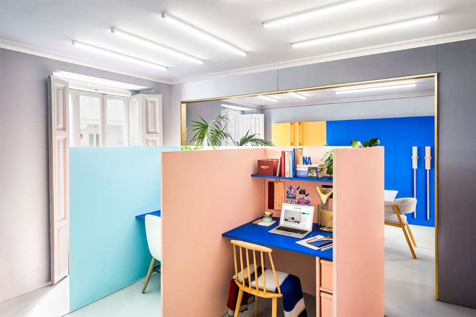 La lettera S divide ciascuna delle applicazioni grafiche in due parti differenti; una divisione che simboleggia il valore aggiunto offerto dalla società di consulenza creativa in ognuno dei suoi progetti. La loro passione per il colore permette di giocare continuamente con le varie tonalità e scegliere quella più adatta per ogni momento e di progetto. Lo stesso concetto è usato per gli interni, che giocano con colori e partizioni.