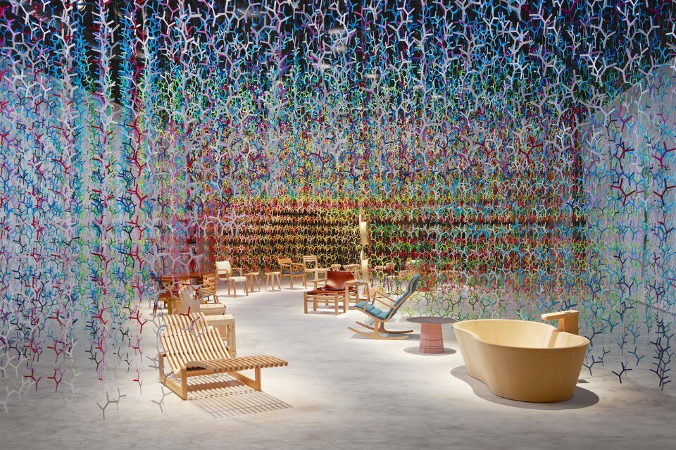 Una moltitudine di piccoli rami colorati diverge e si moltiplica, riempiendo il volume di una sala vuota. Ogni modulo è un’espressione metaforica del fenomeno della ramificazione, che simboleggia l’incontro tra designer e artigiani, in cui i percorsi si intersecano e divergono con esperienze di valore, portandoli a una nuova strada. L’installazione è composta da 20.000 pezzi di piccoli rami (Bunshi) in 100 tonalità di colori, che appaiono posizionati in modo casuale, ma in realtà perfettamente allineati in tre griglie tridimensionali. Una parte del volume viene rimossa, creando un percorso a tunnel, in cui i mobili legno si posizionano lungo il bordo del percorso. Il colore cambia gradualmente come una passeggiata in un tunnel.