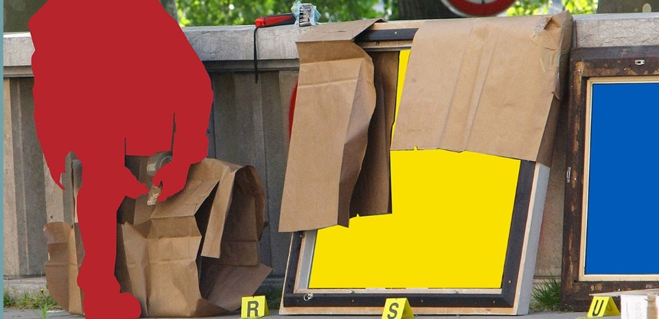 Nella prima sezione sono raccolte fotografie, dipinti e film in cui l’oggetto rubato o mancante diventa un corpo del reato o la scena del crimine. Ci sono opere che richiamano più direttamente l’immaginario criminale, come la denuncia incorniciata da Maurizio Cattelan – Senza titolo (1991) – a seguito di un furto di un’opera immateriale, o Stolen Rug (1969), un tappeto persiano rubato su richiesta di Richard Artschwager per la mostra “Art by Telephone” a Chicago. Inoltre sono presentati lavori che evocano l’assenza, risultato di un furto, come la tela di Adolph von Menzel Friedrichder Grosse auf Reisen (1854), mutilata per ricavarne ritratti di minori dimensioni. Altri lavori, invece, si basano su un processo di alterazione di opere d’arte preesistenti, come Richter-Modell (interconti) (1987), un quadro di Gerhard Richter trasformato in un tavolino da Martin Kippenberger e Unfolded Origami (2016) di Pierre Bismuth che realizza una nuova opera a partire da poster originali di Daniel Buren. Questi lavori approfondiscono la nozione del controllo dell’autore sulla propria opera.
