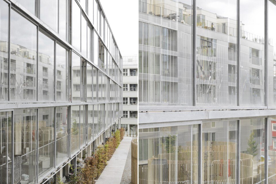 I balconi verso il cortile coprono l’intera facciata e si compongono di una struttura in acciaio con pannelli di vetro scorrevoli, incorniciati in acciaio zincato. Questi spazi si estendono nella zona residenziale, e sono ampiamente utilizzati dai residenti. La possibilità di inserire questa caratteristica supplementare nel bilancio è dovuta al costo relativamente basso della tecnica di costruzione. Usando elementi prefabbricati in calcestruzzo e pareti divisorie come elementi portanti, il metodo di costruzione è stato semplificato e il tempo di costruzione ridotto in modo significativo.