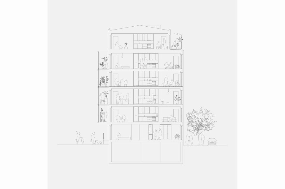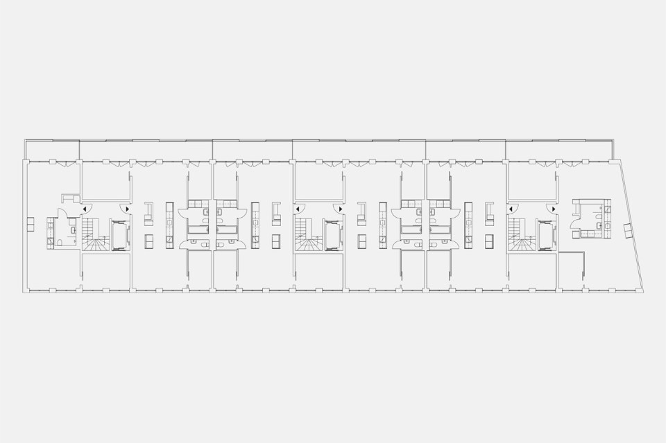 Le piante sono organizzate intorno a uno spazio aperto che percorre tutta la profondità e contiene il soggiorno, l’ingresso, la cucina e la zona pranzo. Ogni appartamento ha un nucleo centrale composto da ingresso e cucina. Il soggiorno e la sala da pranzo possono quindi essere determinati dall’utente, che sarà libero di orientarli verso il cortile o sulla strada. Tutte le camere si collegano allo spazio principale, senza corridoi.