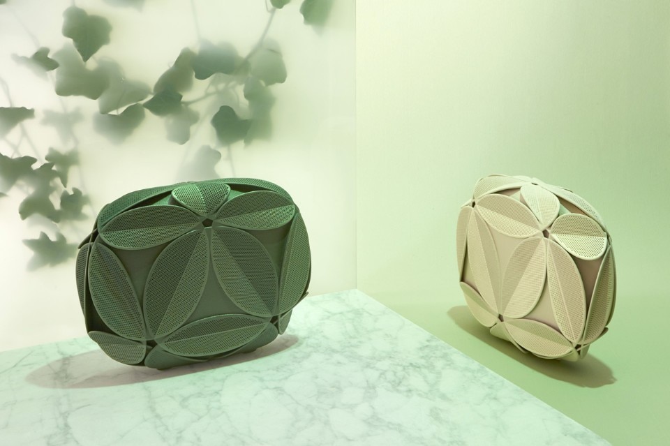 Il risultato di questa ricerca geometrica e razionale porta paradossalmente a un effetto decorativo: ecco allora le superfici sovrapposte trasformarsi in foglie e diventare la chiave di un pattern al limite dell’ipnotico, che disegna cerchi e fronde esagonali. Un ritmo gioioso che parla di fiori e foglie lontani, di un’edera colorata e rampicante che tutto avvolge.