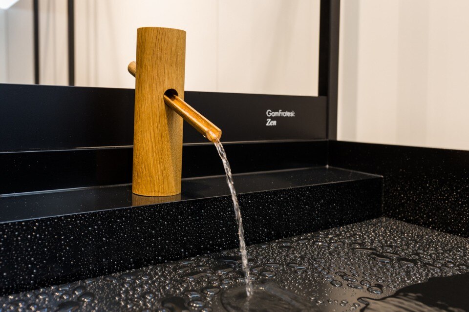 Zen interpreta la classica fontana di bambù orientale. Per il duo di designer GamFratesi la perfezione della natura si manifesta in una forma di miscelatore minimalista in legno, attraverso il quale l'acqua scorre in maniera mediativa.