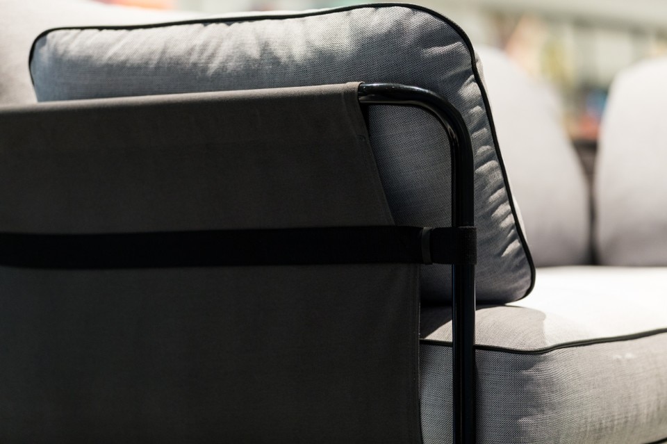 Viene infatti fornito in una confezione piatta, pronto per essere “scartato” e assemblato a casa perché ha una struttura in tubolare d’acciaio leggera sulla quale fissare una trama di resistentissime cinghie che costituiranno la base della seduta, mentre una serie di pannelli in tessuto diventeranno lo schienale. Questo lavoro con il kit di assemblaggio si completa con a cuscinatura. È un progetto che possiede il linguaggio progettuale delle tende, o comunque di strutture mobili che sono sempre pronte a viaggiare, o a seguirci facilmente nel corso di un trasloco.